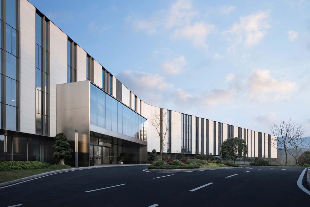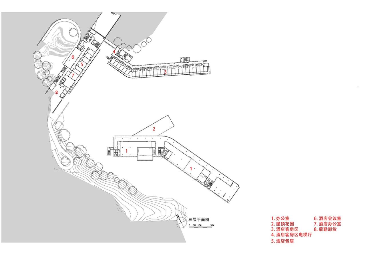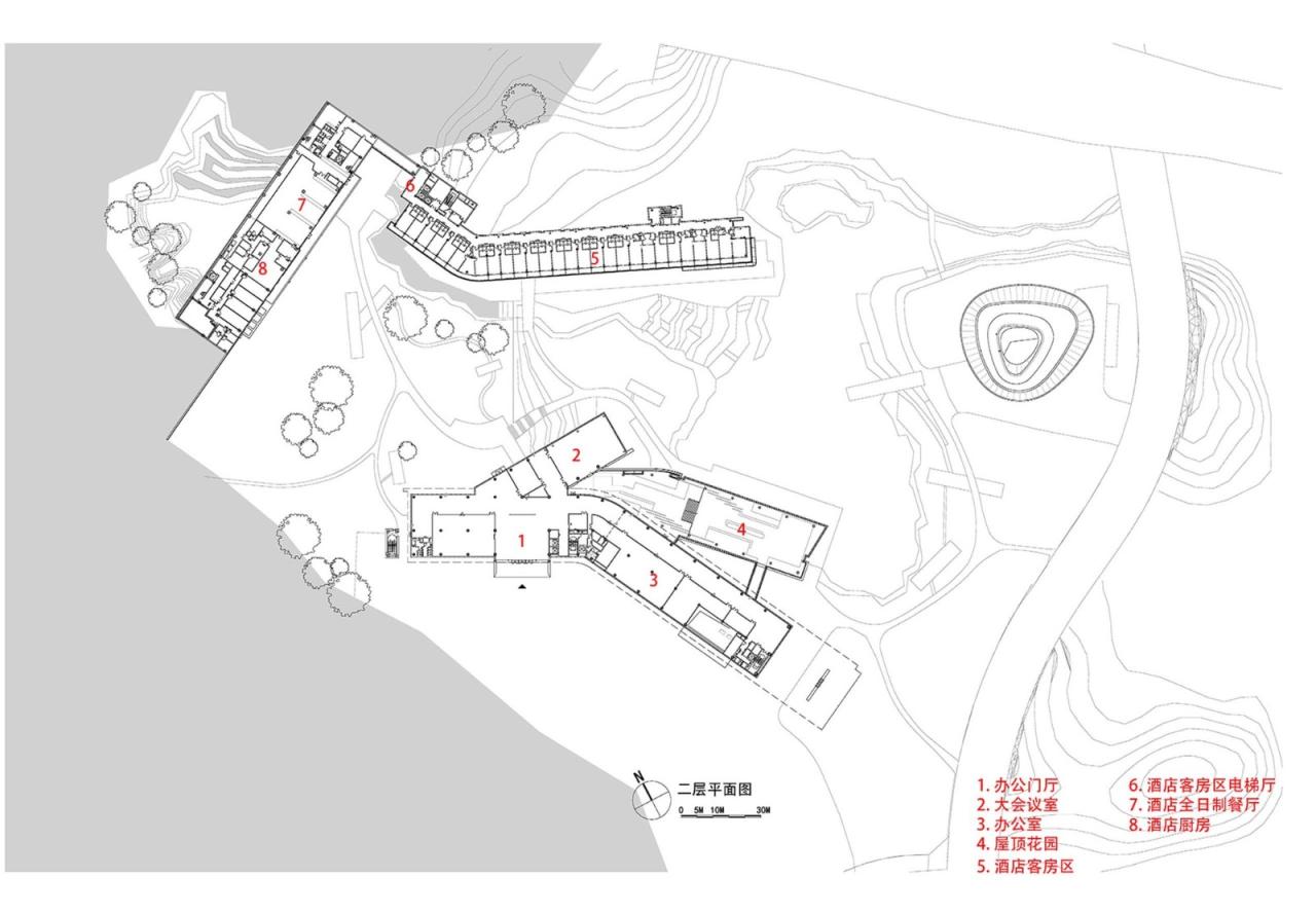 “填谷”山的延伸融合中心是两江协同创新区首开项目之一,承担开区发办公会议,行政商务,旅居及商业配套等功能,其中包括 1.2 万平米科创办公及服务中心,1 万平米的精品酒店,5 千平米车库及 1 千平米的商业服务配套。基地两侧被山体拥护,天然形成谷地,整体山势从场地西北向东南逐级跌落,形成了“山谷坡水”的空间景观结构。建筑通过“填谷”重塑山谷空间,实现“山”的延伸,同时也减少了土方,建筑形体通过扭转变形,激活山谷空间,酒店入口通过私享山谷的氛围营造和廊桥的架空,营造出酒店的“遁隐”的体验。