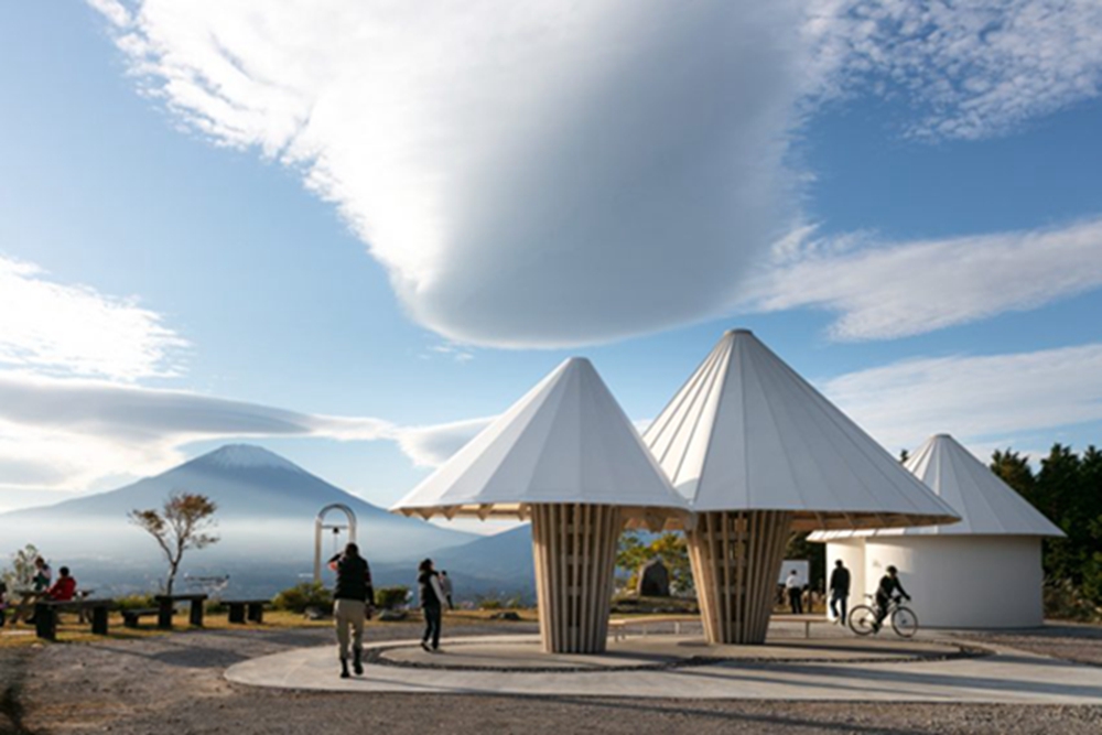 宣誓山公园(Oath Hill Park)是一个休息区,位于日本小山镇(Oyama)东郊一条广受欢迎的徒步小道旁的乡村山区,有厕所和观景台。隈研吾为这个小“公园”设计了一系列伞形木建筑,这些建筑类似于远处富士山的锥形雪峰。