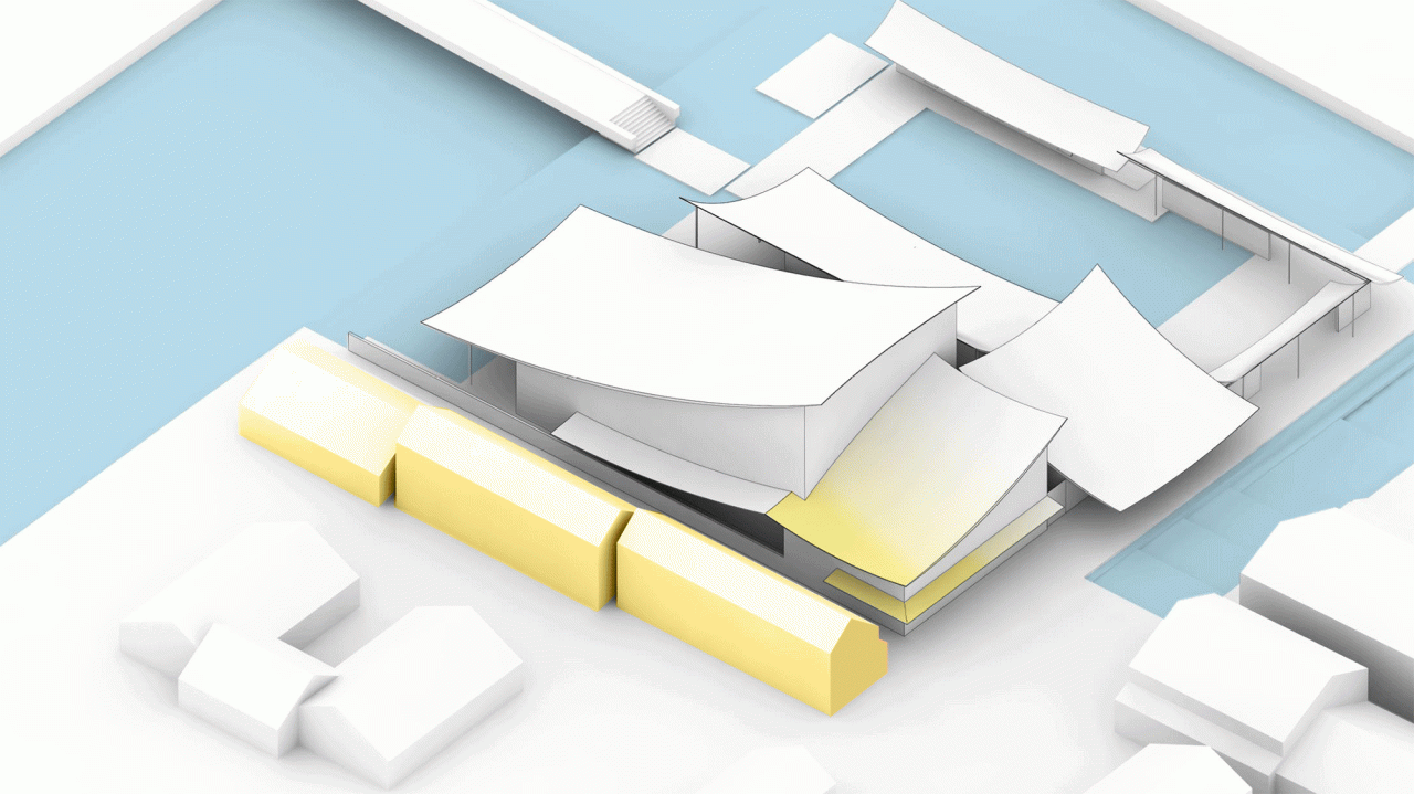 屋面由中心向四周延伸,解构的屋顶分别对应不同的功能分区:门厅、序厅、展厅和服务,构成不对称的风车状微型聚落,在古典建筑对称性构图的基础上增加现代建筑非对称的均衡感与动态性特征。