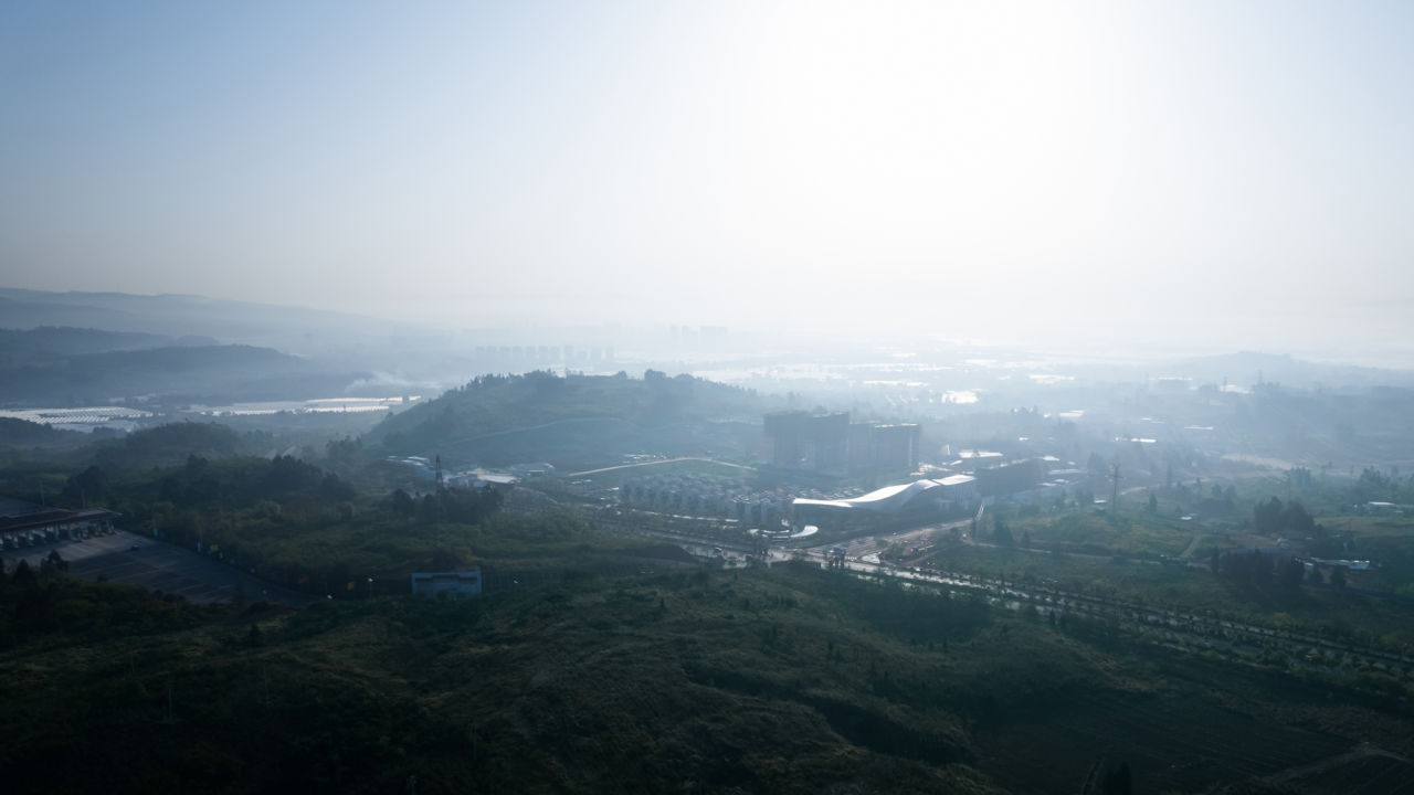 嵩明绿草碧野,林壑优美,蔚然深秀,设计汲取周围自然延绵的山脉曲线,形成如飘带般流畅顺滑的曲面作为建筑的主要造型元素,从飘忽的概念形象抽象成为核心建筑设计灵感,在远山翠色中以具有漂浮感的“丝带”赋予环境新的视觉元素。