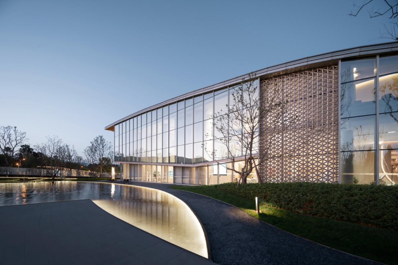 柔软的飘带从屋顶变化为立面墙体,又转而变回屋面,相互渗透延展空间,形成优美的弧线。虚实变化的建筑立面兼顾功能和美感,协调处理造型和功能之间的关系。