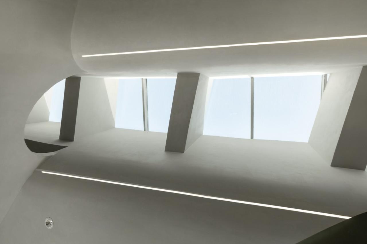 设计沿屋脊线形成带状的天窗,贯穿整个建筑,形态修长,曲线优美,为屋顶带来了虚实对比的变化,交通空间引入采光,在第五立面上强调了“廊”与空间的逻辑关系。日光与空间中大片纯粹的白色共同营造了一种柔和空灵的氛围,人行走其中或进行一些交流活动时会有接近自然的光照环境。