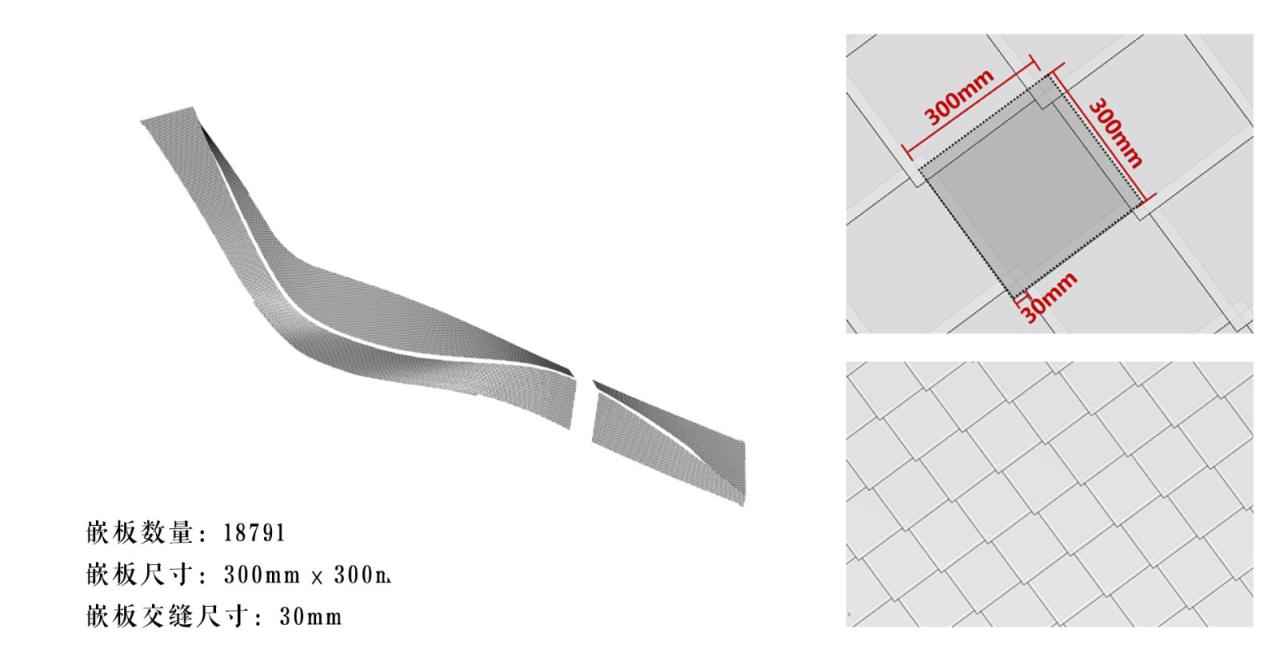 屋面表皮选用30*30mm铝板适应屋面形状嵌于屋顶,选定特定区域,输入比例为2%由REVIT随机生成异色铝板,大面积采用素雅的银色铝板,选用深灰色铝板点缀于其上。