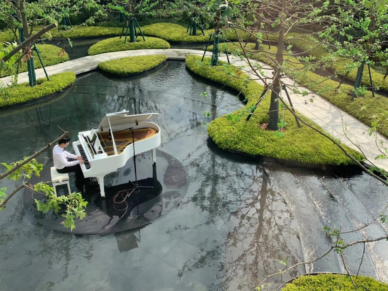 建筑中央区域是名为“光之庭”的下沉庭院,以庭院为中心所展示的公共空间拥有良好的采光及景观面。建筑南侧有一片水景“康之庭”,搭配周边的景观设计,体现出中式传统园林中“移步易景”的特点,同时也为参观者提供了一个户外亲水休憩的公共空间,在整体上通过现代手法再现园囿的空间精神。