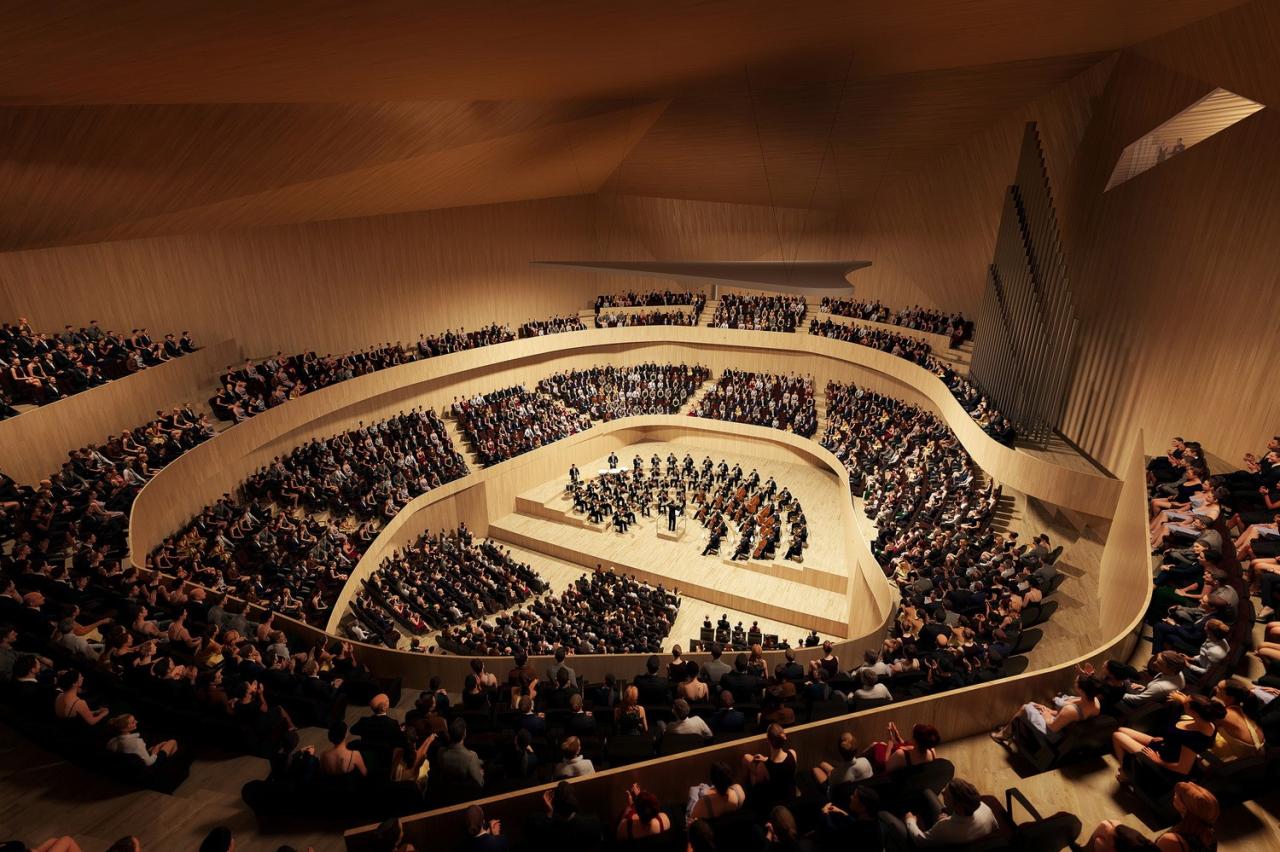 据BIG建筑师及合伙人 Bjarke Ingels 所说,建筑的屋顶有着各自的棱角,它们或向上挑起或向下沉落,形成交错且相互连接的屋檐。而屋顶下方的柱廊则按照独特的律动排布,从而支撑着悬挑屋顶,并呼应了管弦乐队精妙合奏下的旋律。此外,屋顶下方表面将由波西米亚森林产的木材覆盖,温暖的木材将从室外渗透入室内空间,从而创造了更多用于聚会或艺术表演的非正式空间。