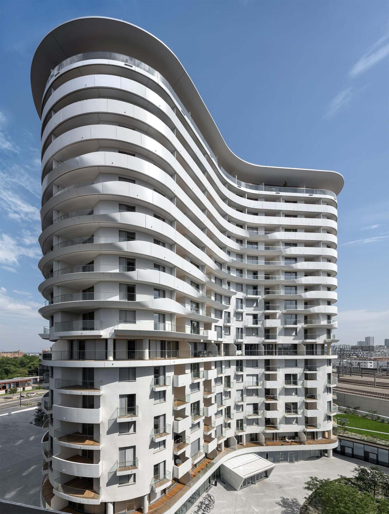贝尔维尤塔坐落在维也纳火车总站的附近,毗邻贝尔维帝中央区(Quartier Belvedere Central)的瑞士花园(Schweizergarten)。住宅楼如同一个正在流动的巨型架构,展示着类原生细胞体的有机形态。建筑的外围护栏带由白色亚光铝板所打造,环绕着建筑边缘,并在特定区域根据风、声、光等不同的环境因素有节奏地延续、扭转、暂停,由此统一了不同立面区域的实墙、玻璃、线性元件及点状阳台等元素。