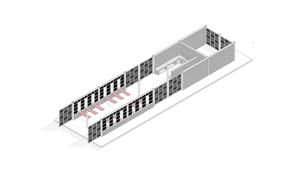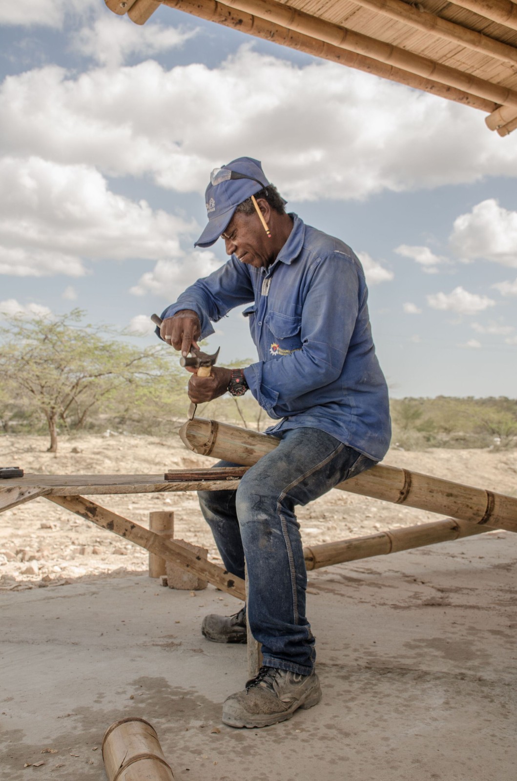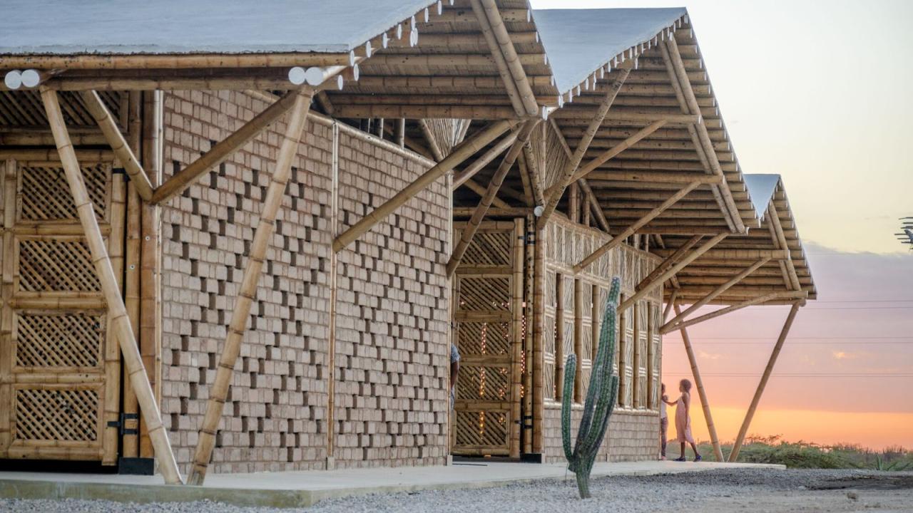 Wayuu 集体记忆中的许多元素都在建筑中得到了体现。与当地建筑一样,学校使用泥土作为主要成分,但以不同的方式具体化,使用压缩的泥土块。这使得墙壁上可以产生格子,为内部空间通风,并设计出典型的 Wayuu 模式。折叠式天花板指的是在沙漠中间耸立的山峰,这些山峰不仅是景观中的参照物,而且在Wayuu人的宇宙观中也具有非常重要的含义。最后,主厅墙壁上的 Guadua 产生的纹理是对当地建筑中图案的重新诠释,随着时间流逝,bahareque(抹灰篱笆墙)的内部骨架逐渐显现出来。