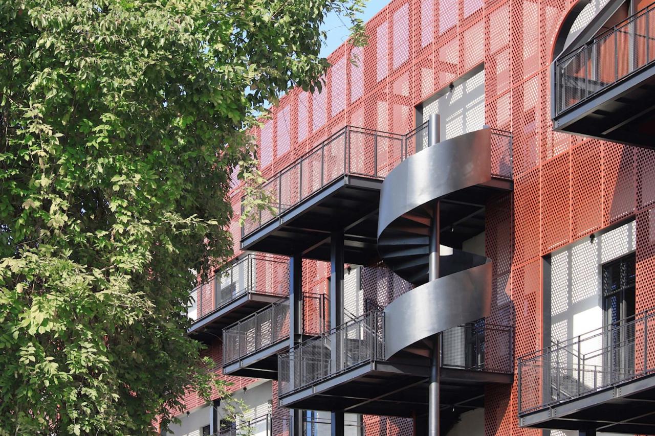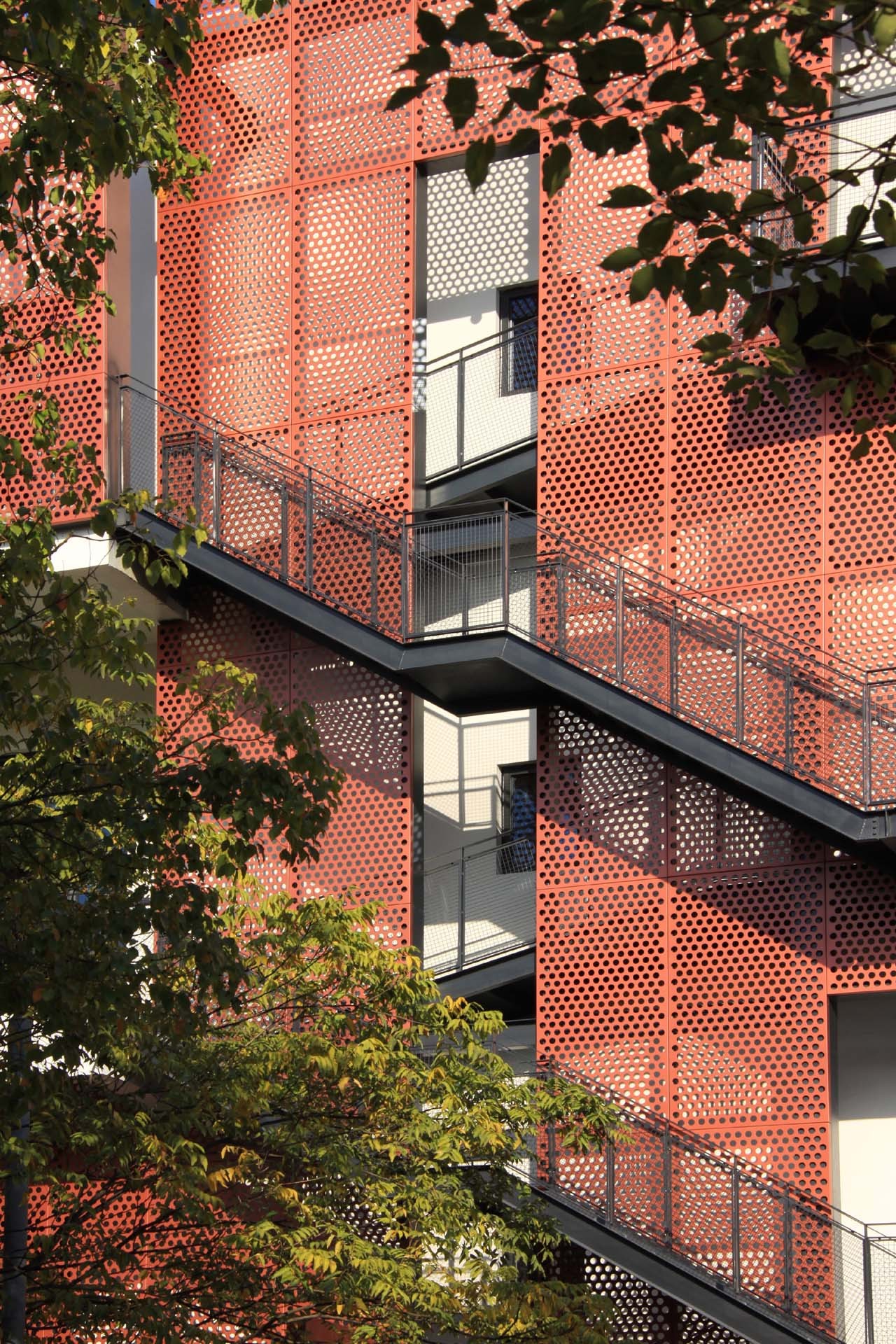 墙上的社交的想法来自纽约的外挂火灾逃生楼梯派对。看过电影《蒂芙尼的早餐》的人,都记得那首奥黛丽.赫本的moon river。迷宫社区不仅兼顾了疏散,在墙中穿梭,也有丰富的趣味。近一半的路径藏在墙后,从外面看,平台路径似乎莫名其妙的中断,形成了一个迷宫 "Wall Maze"。为了尽量减少对原始结构的改动,加出来的一层穿孔铝板。也是想给未来爬藤植物或者单元种植留一些可能性。