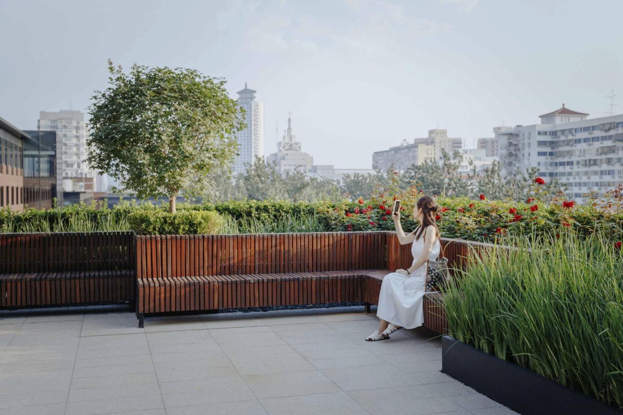 改造中极尽利用每一处可以作为景观的场所。建筑的楼顶层局部打开屋顶,形成空中庭院。高低错落的花箱配合观赏花卉将屋顶营造成为员工的休息平台,为每个人都提供了身心放松的场所的休闲场所,同时也阻隔了西二环路带来的嘈杂城市氛围,成为一处静谧的场所。