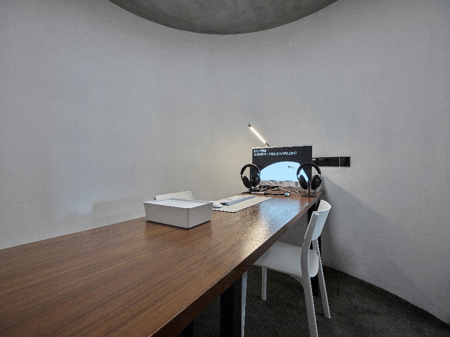 录音等候区是一处内外交织的空间。光线为这处空间照射出千变万化的图像。建筑圆形平面在此处被感知。