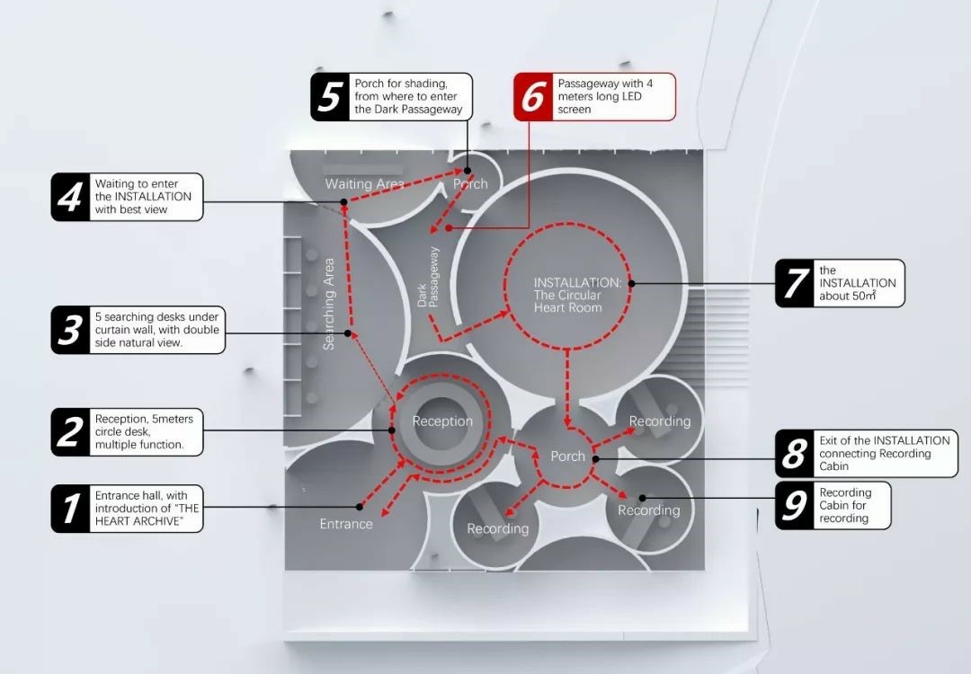 录音等候区连接了三个录音室,参观者在录音室记录自己的心跳,并将自己的心跳永久性的保存在艺术家的心跳档案中。
