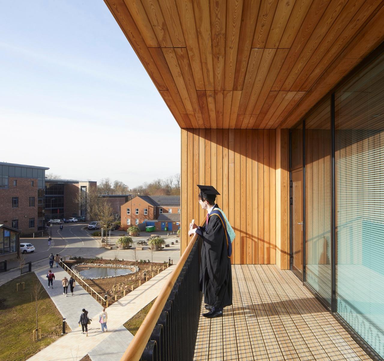建筑师在约克圣约翰大学创意中心的设计中采用了“肌理优先”的设计方式,并采用了如胶合木及交错层压木材等大量低碳建材,由此在使用大量木材的同时,创造不同肌理、质感的内部空间。同时,项目还采用了被动式设计原则,从而在可持续设计上取得了 BREEAM 出色(Excellent)级别的评级。此外,建筑师与环境设计顾问 Atelier Ten 合作,他们在项目中采用了三层玻璃、打造气密建筑、提供如可开启窗户等简易的操作系统、并在教室运用由机械和自然通风共同组成的混合通风系统,由此让创意中心可以取得生态建筑的认证。