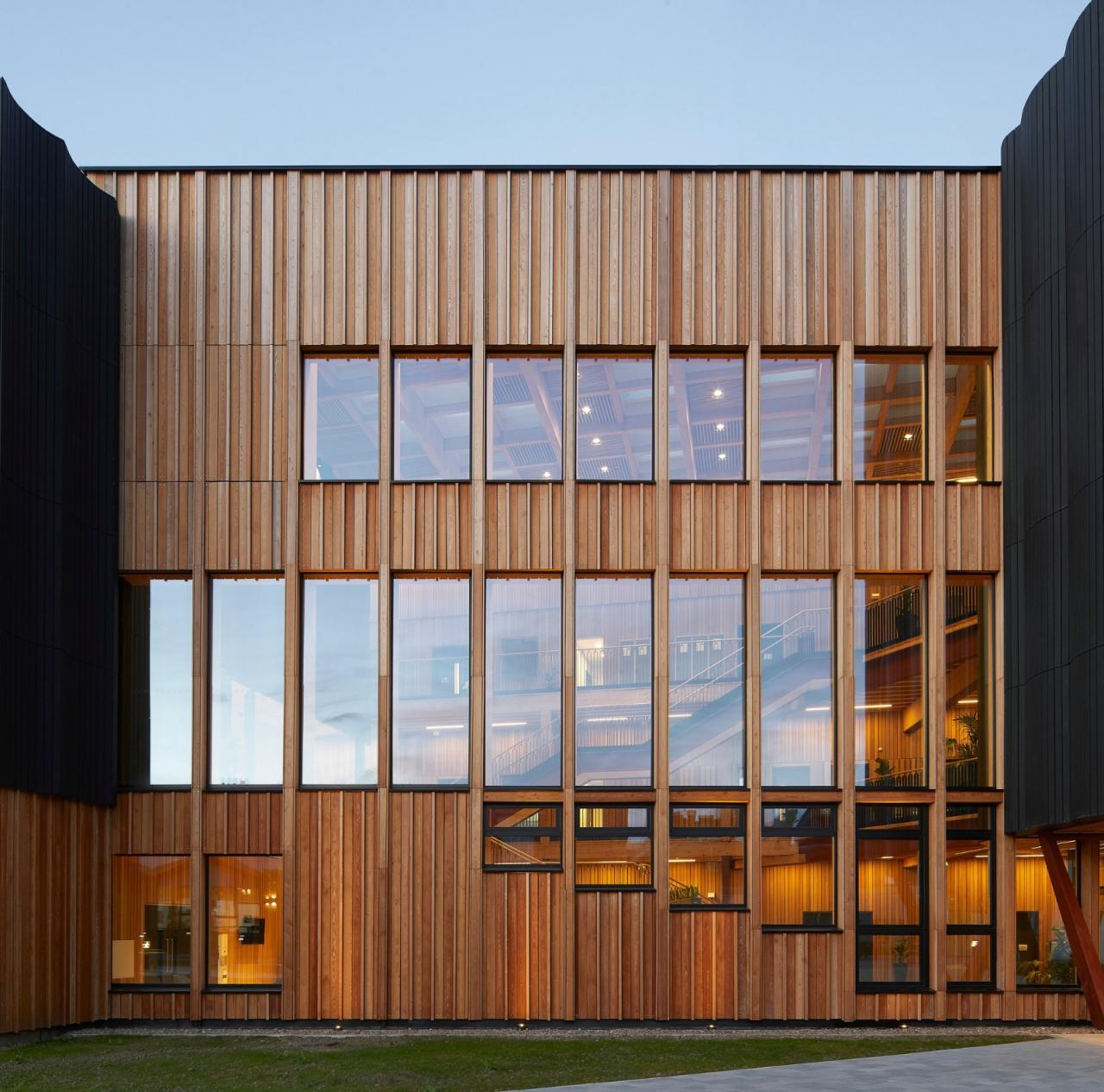 创意中心通过材料的运用以及对与周边景观关系的细致考量与自然环境相连接。建筑整体主要使用木材建造,从而营造了温暖且欢迎的友好氛围。同时,立面上的大窗户也让光线和空气可以流入其中的不同空间。全新的创意中心与其临近的设计中心之间则由一系列相同的小径连接,这些小径也通往校园内一条易于导向的步行街。此外,建筑师和景观设计师为市长的“人行校园”打造了以景观为主导的规划,并让其作为创意中心设计过程的一部分,以此确保校园可以真正地改善学生的步行体验。