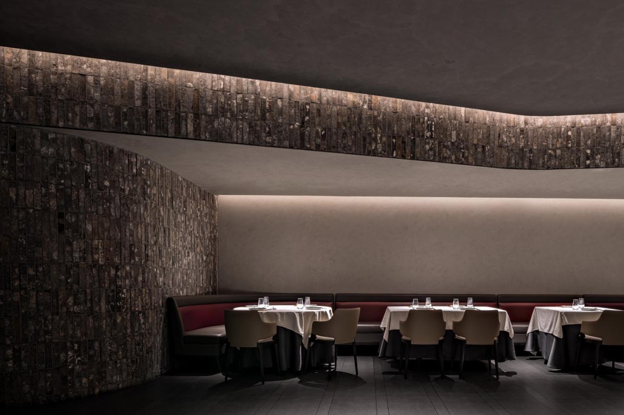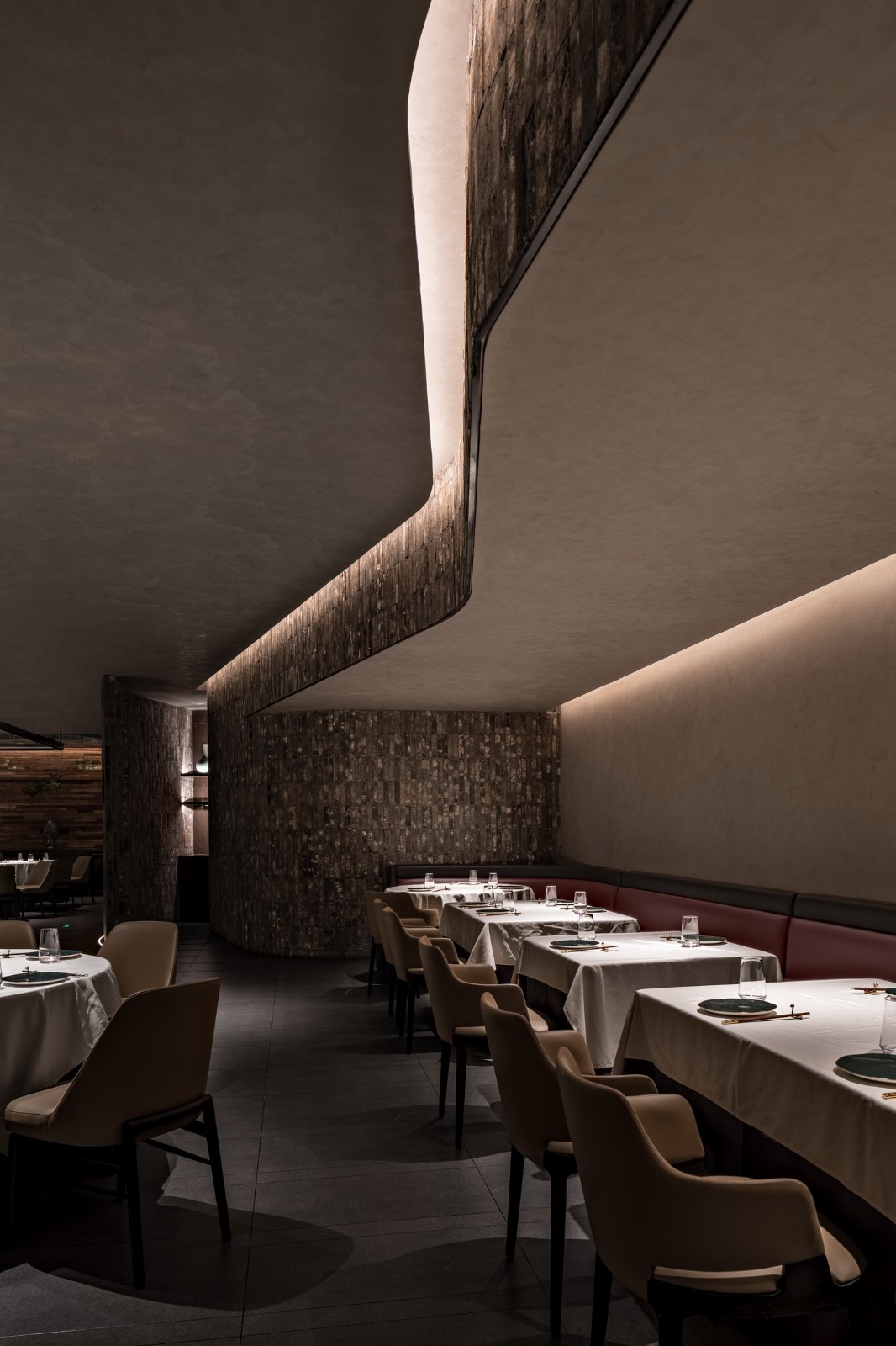 整个空间最北侧,粗粝条砖包覆整个墙面,又与天花相连,墙体结构回转蜿蜒,凹处设卡座,旋转开启处则恰好进入VIP包间,室内的建筑感在此处达到顶峰,无论餐桌烟火还是人文奇景都归于平静,只剩一个粗粝又丰盈的“大背景”。
