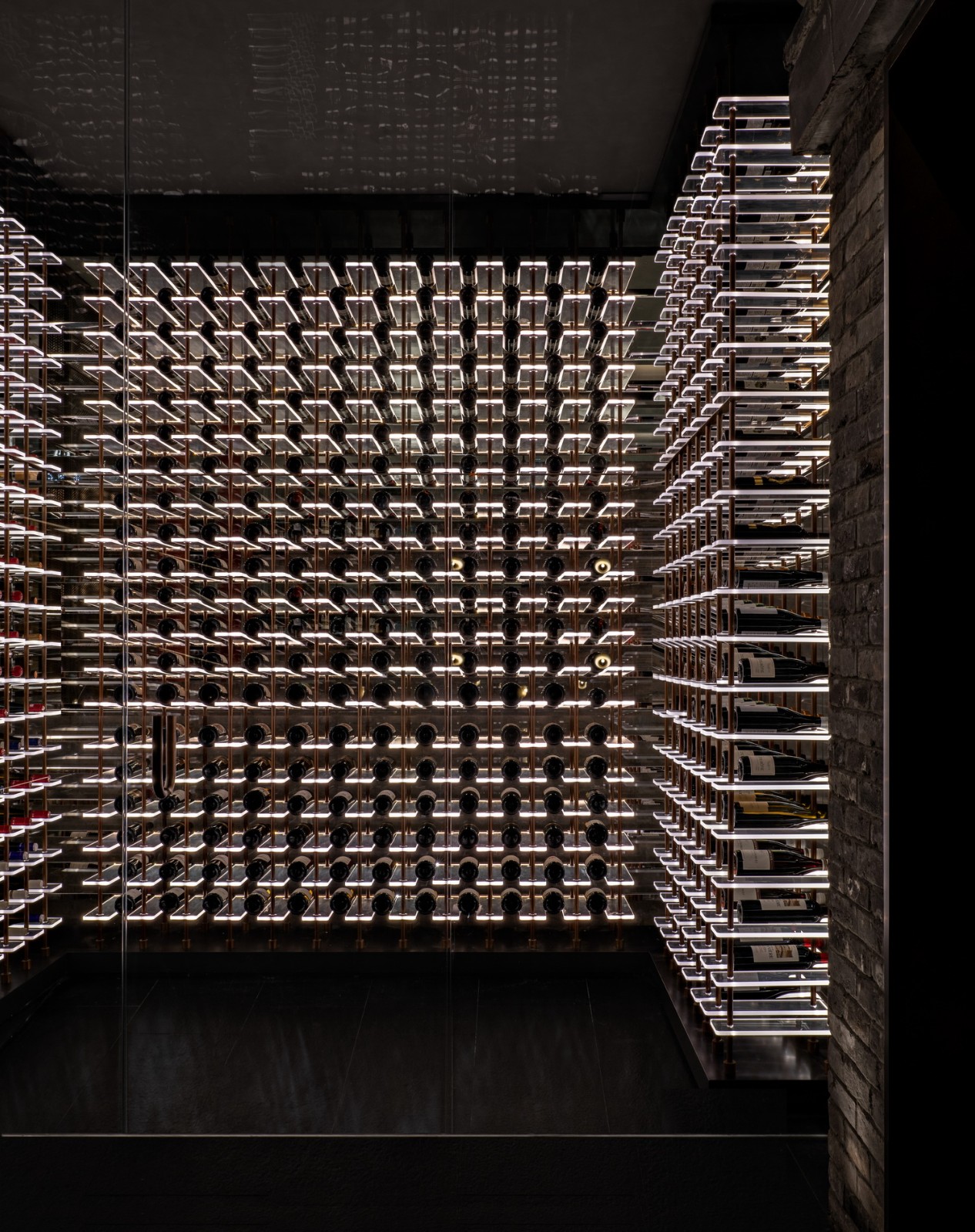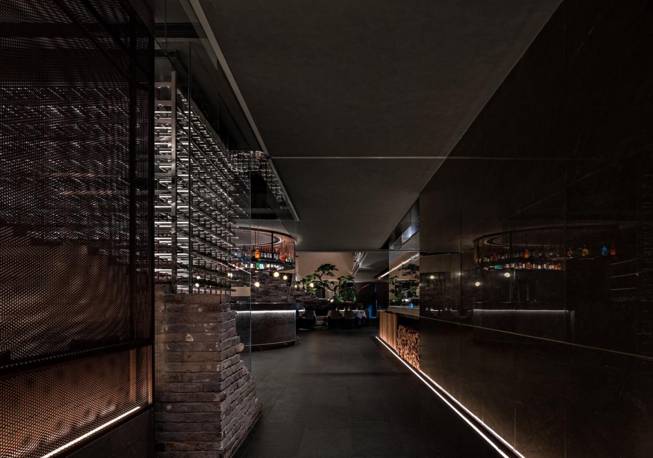 从等待区穿过青砖灰瓦的京城民居门廊进入主入口,三面通亮的开放酒窖与沉入暗调的U型吧台一左一右将空间氛围拉入截然不同的另一端。老砖石堆砌的斑驳墙面和金属亚克力等现代材料重叠,场景和时间的拼贴重叠散发迷人的张力。