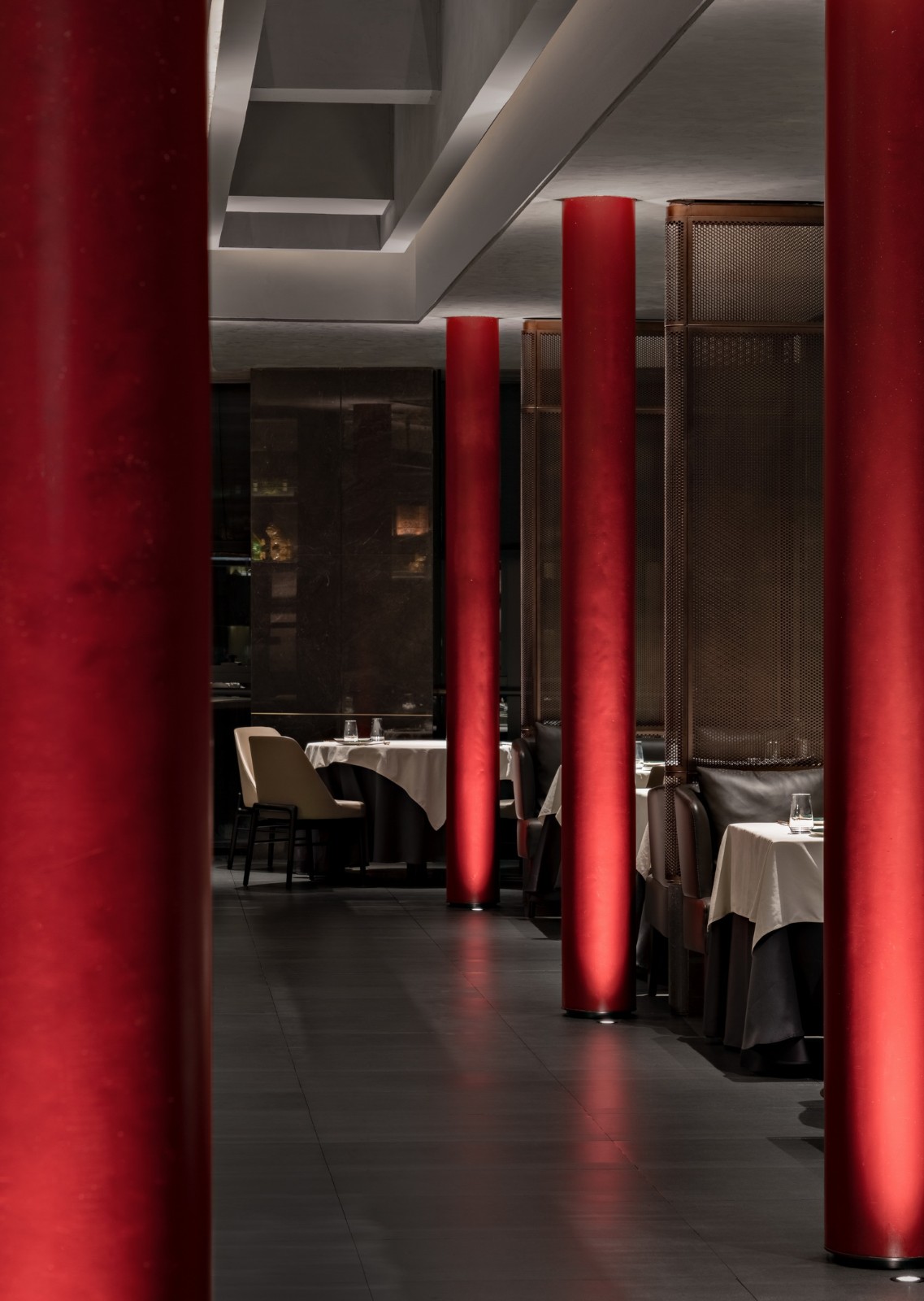 主入口北侧,卡座与圆桌排布更强调秩序感,朱红廊柱为素色空间点睛,金属网隔断隔而不绝,步入便有层层递进的仪式感,砖石颓墙在这里延续呼应,灯光悦目的酒窖点亮空间深处。对侧原始古朴的木质墙面通过材质转换顺势切换至另一功能区。