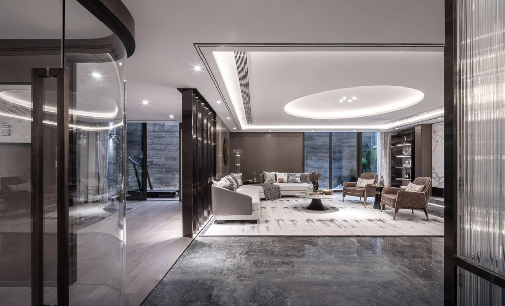 入户大堂门头则选用了金属挑板和墙面艺术透光玻璃的组合,入口处景观的定制级灯饰、高档石材、以及金属材质,体现一流的品质感。