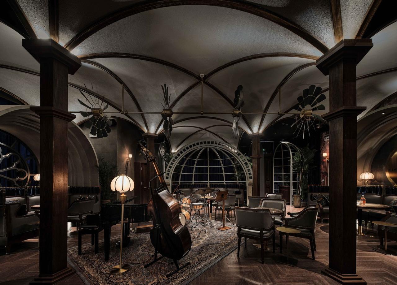 几何弧形、拱顶与花格窗,颠倒内外的趣味空间关系让构筑中的自由精神轻盈流动,人们沉浸在氛围幽深的连贯空间中,被探寻的厅堂秘境引领着志趣相投的酒客们与维多利亚时代的飘逸对望。