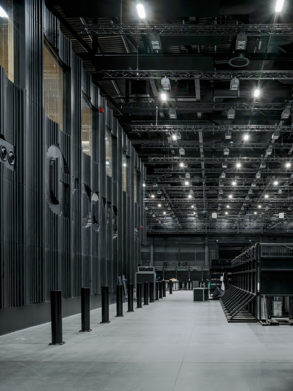 该实验空间的总面积约为 4,000 平方米,体积为 44,000 立方米,高 10 米,以及设计了 40 米结构净跨度,可容纳大量不同的研究实验。实验室还配备了室内音乐环境和音响系统,可测试空间、颜色、灯光、气味、能见度、外观、触觉和声音等环境条件对人的行为和感知的影响,使实验条件尽可能接近真实场景。实验室内部是黑色的,背景声级和混响非常低,这是建筑设计的核心部分,旨在消除人们“身处建筑中”的感觉。
