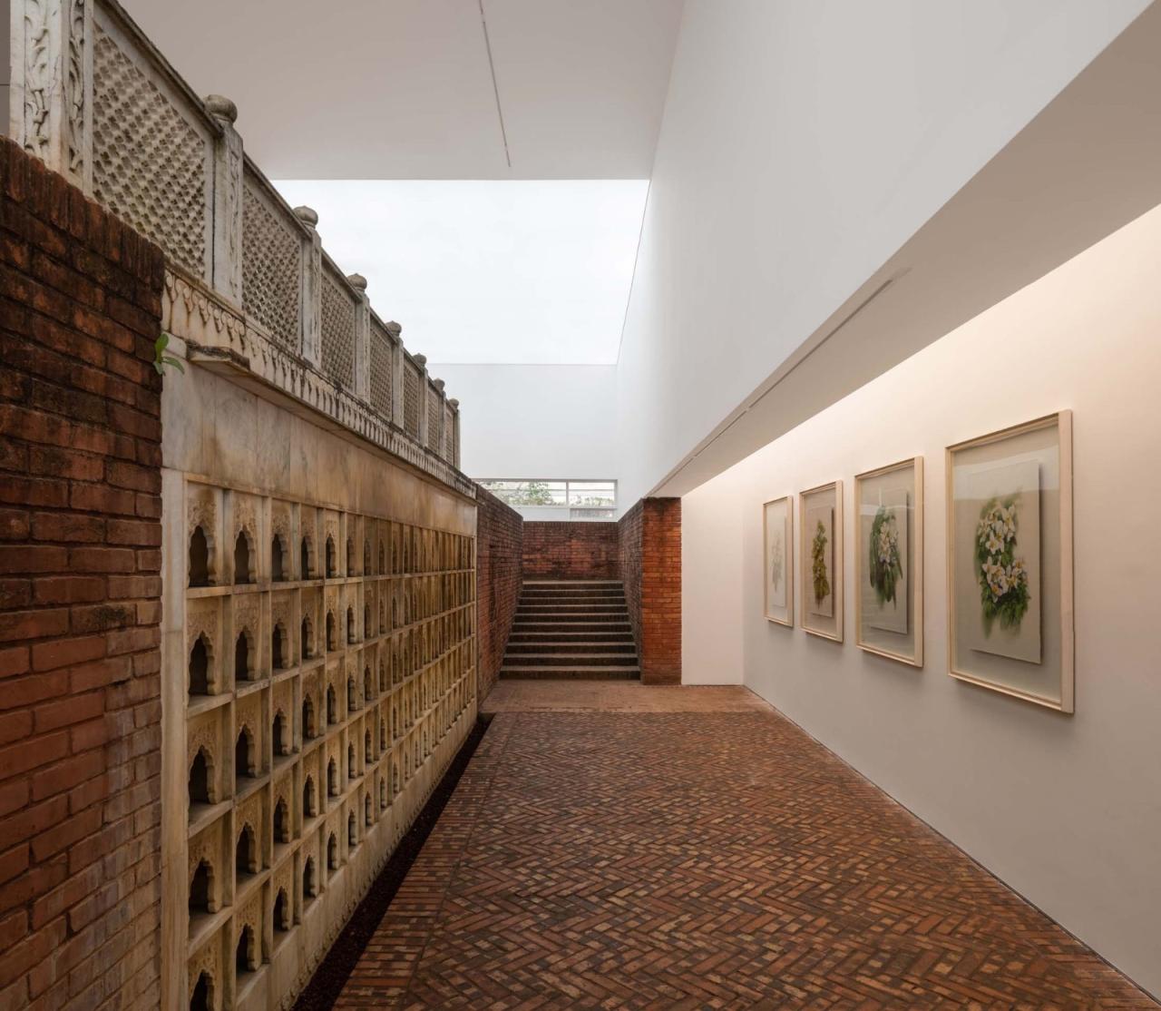 最终的方案没有砍伐一棵树木,原有的巴基斯坦风格凉亭、碑文、大理石栏杆和壁龛、石头座凳都被完整地保留并成为美术馆的一部分。红砖作为室外铺地材料被包裹到室内,又延续到室外;画作之间有节制地开放面向庭院的观景框—内和外的边界被模糊。人们在参观画作的同时在室内、室外和半室外空间里穿梭。