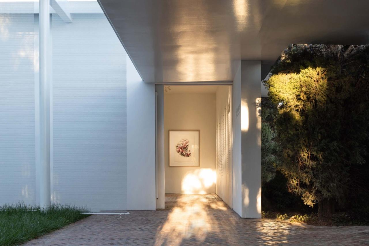 由展墙围合的美术馆可以看作一个悬浮的实体,然而外侧包裹的一层金属网格帘则使得它的边界产生了偏移。新的界面对自然环境进行了抽象和过滤,也使得原有的植被和新的景观设计之间产生了层次,人们甚至可以走进两层表皮的内部。树影透过帘子被网格分解后投射在墙面上,深深浅浅的灰色调被像素化以后分辨不清是树叶还是枝干。这层介质转译了阳光,树木,风和时间,这是只属于这块场地的画作。