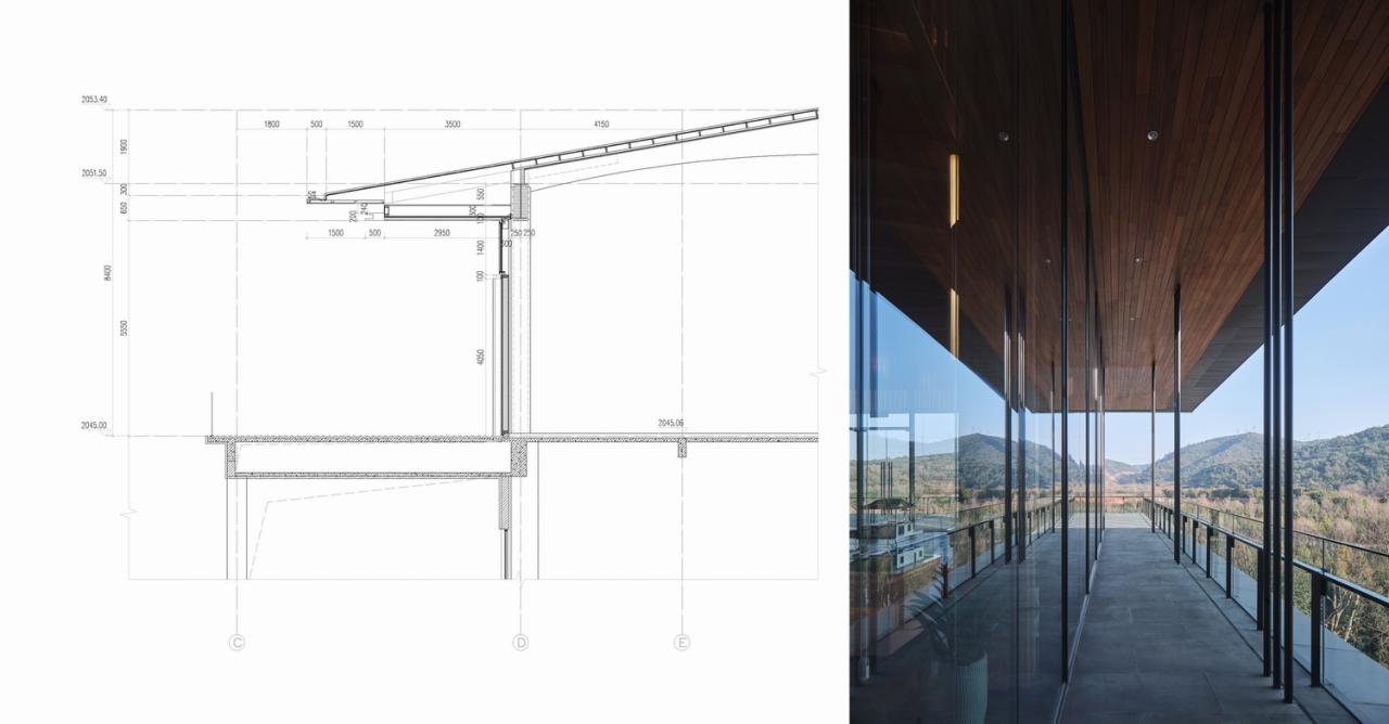 檐廊、露台、玻璃幕墙的组合,弱化了室内外空间的界限,使得山水景观自然延伸至建筑内部,并给予场所更加舒适、安全的观景空间。明隐幕墙框的交替运用,也层次性拓展了通高局限下玻璃幕墙的最大展示面,形成韵律感界面。