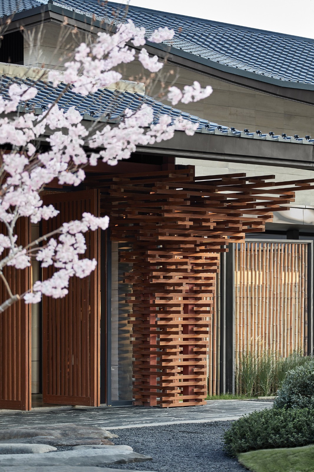 庭内入口最大化融合当地的竹子材质,使用禅意象征的空心柱,一空万有,于形简意切中,融入本真世界。