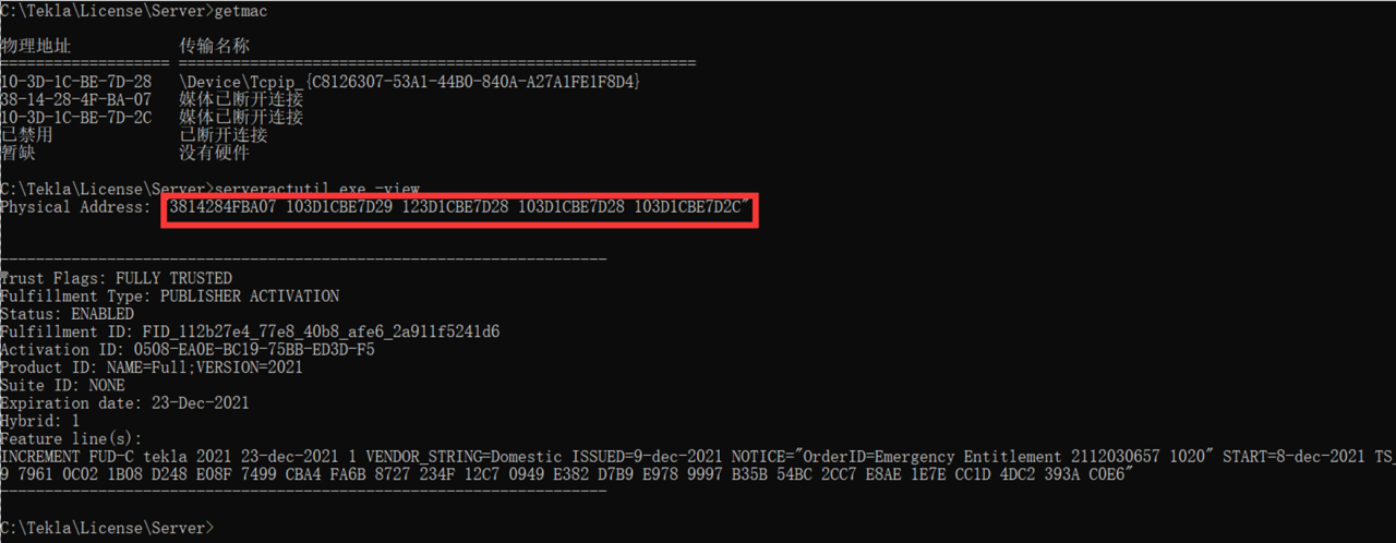 第一步:定位到lincense server文件夹,并输入getmac 和 serveractutil.exe-view命令,找到该电脑的物理地址和显示在此电脑上激活的license激活数量。
