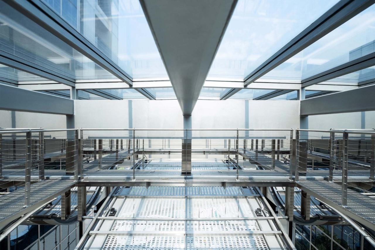 中庭东侧采用索网玻璃幕墙,其竖索和横索两端的锚具和预应力保持装置被巧妙地隐藏起来,创造了非凡的通透性和简洁性。中庭西侧布置有6个空中廊桥,在结构上承担起玻璃幕墙的荷载。中庭顶部悬吊有吊顶系统,其云朵状吊顶板采用穿孔铝板,可以过滤日光,同时又集成晚间照明。吊顶板上方设有维护平台,工人可由此清洗上方的玻璃屋顶,或者穿戴安全装备到下方更换灯具。