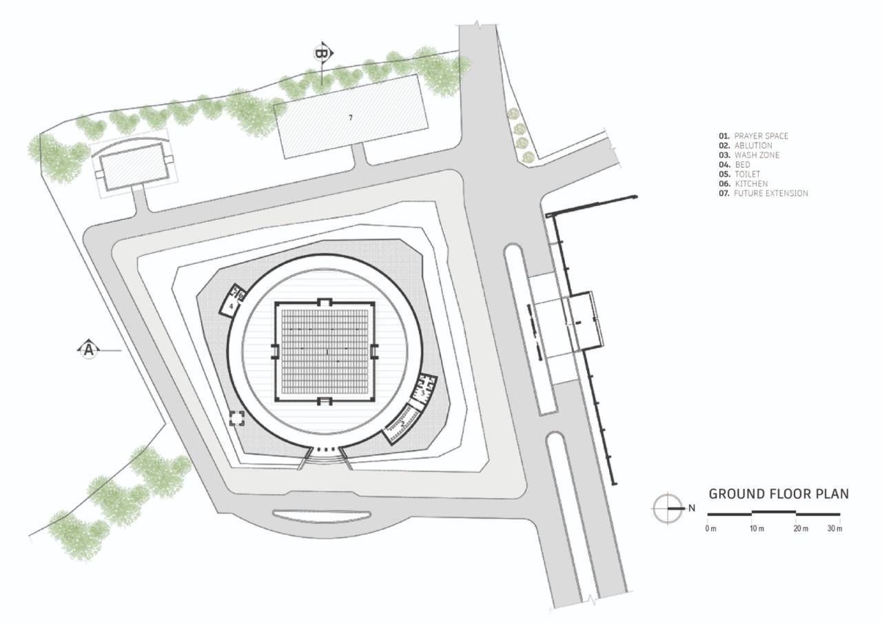 建筑体被圆形的半户外空间所包围。这个露天空间是主厅内光线和空气的来源。建筑的底部空间开放,将室内和周围环境连接起来。可操作的玻璃门允许空气通过室内,使空间保持凉爽和舒畅。圆形的半户外空间被高墙包围,以阻挡熙熙攘攘的重工业外环境的细微影响。半户外周围的景观逐渐倾斜,使建筑体与周围环境融为一体。这种上扬的景观创造了一个下沉式庭院,建筑群坐落其间。在繁华和嘈杂的工业活动中,这个庭院依旧保持平静和安宁。作为一个整体,该建筑形式给出了一个新的形象,或者说开发了一种新的清真寺语言,它更多地是一种转变,简单但独特,大胆又同时融于环境之中