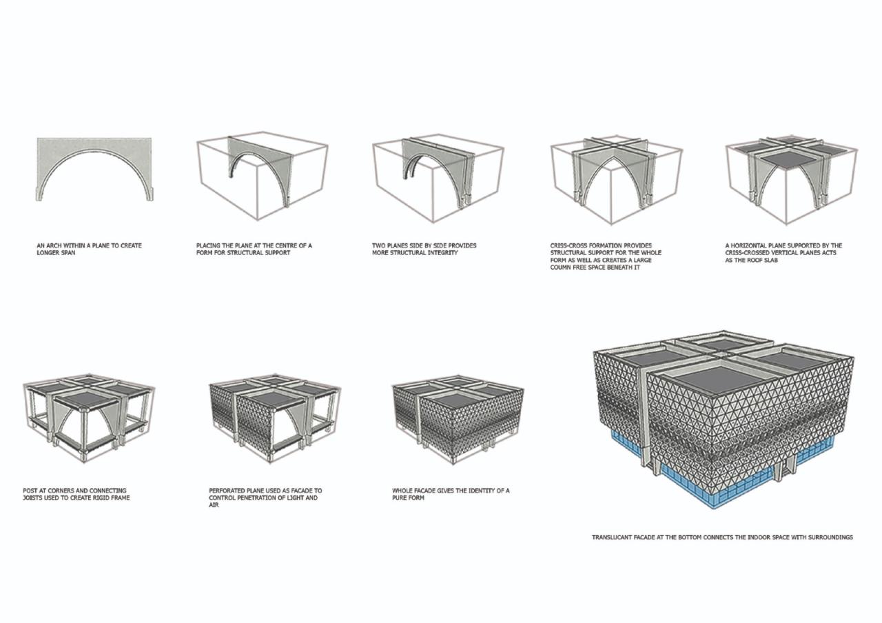 单一的几何形体描绘了在设计方法和形式表达上纯粹性的意图。由该形式创造的单一空间内容纳了祈祷大厅,其规模和意义的重要性都不言而喻。这个巨大的形式在结构上由两个交叉的拱门支撑,这有助于在不打断空间连续性的基础上,创造超出预期的单一体积的空间。纵横交错的结构使人印象深刻,它创造了悬在祈祷大厅上的一个无形的圆顶的形象,是清真寺建筑象征。