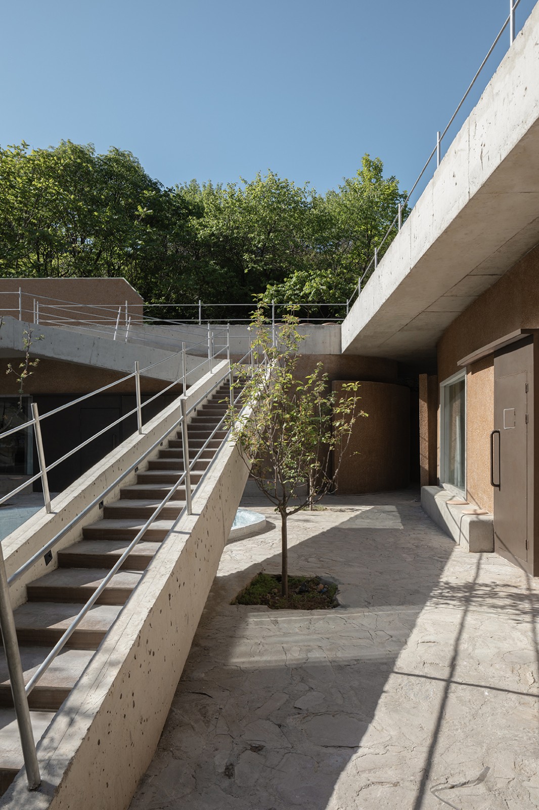 屋顶东面和南面与山腰间的野树林相融,人们在此可游可闲!