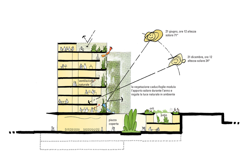 在建筑的不同高度设置花园露台系统,形成垂直花园,在增强立面可识别性的同时,有助于利用生物气候特性,提高室内舒适度。