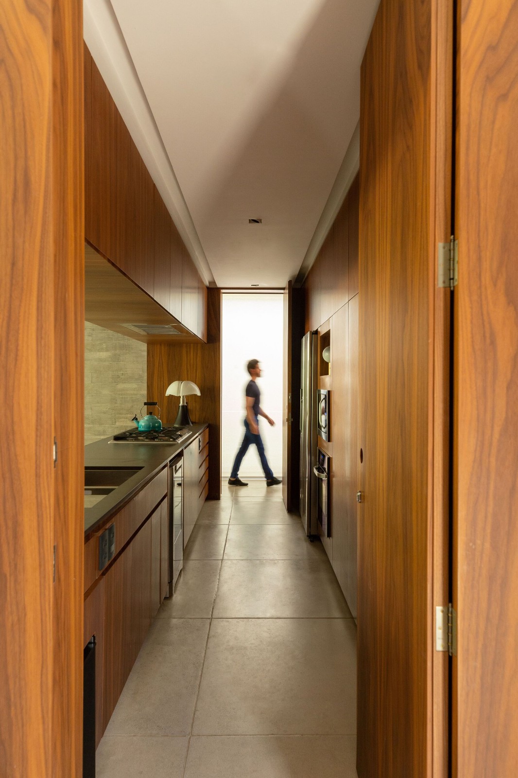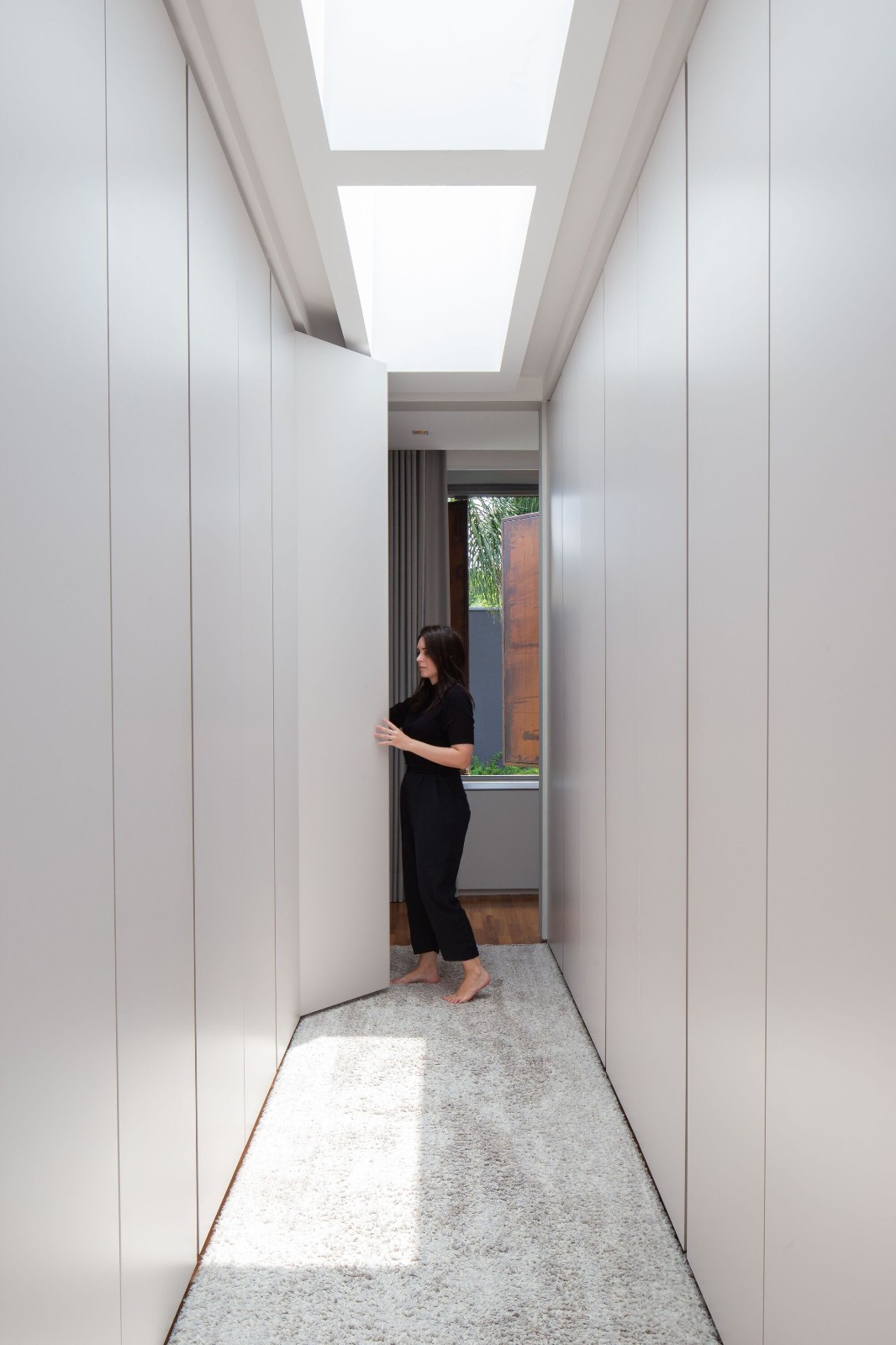 就像一个放置在清水混凝土墙上方的金属容器,这座房子与周围环境建立了两种类型的关系。上层可以 100%封闭以阻挡阳光,保证隐私性和隔音的私密空间。如果需要另一种模式,立面可以在照明和通风的节点打开。