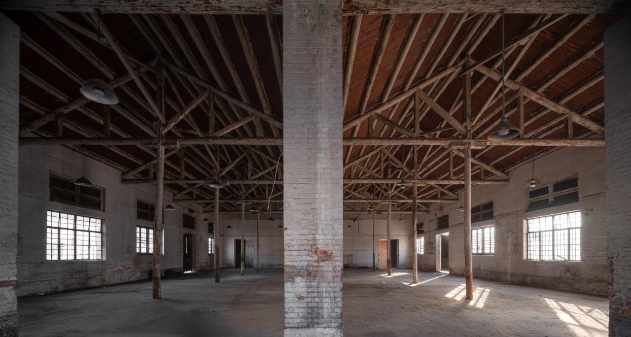 这间上世纪五十年代至九十年代的粮食仓库老建筑,总体园区由59栋老建筑组成,以前用作粮食仓储、工厂车间、谷仓等,经过全新规划升级为云间粮食文创园;该建筑的概念设计很快就被确定,通过大规模翻新将其改造成了当地文化地标性艺术展馆,从而使其重复生机。