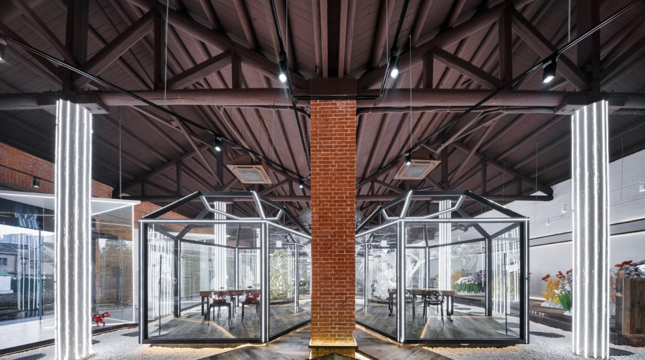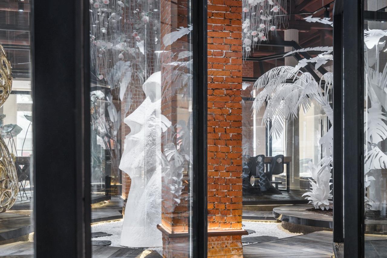 展陈设计层面,设计师将“自然共融”的理念具象诠释,以三角异形落地玻璃“橱窗”为概念完成前端开口,增强空间内外的互动关系;馆外,可直观感受空间的艺术氛围,如橱窗;馆内,局部场景与灯光视觉界面构成的诗意,形成了空间连续性的感觉。