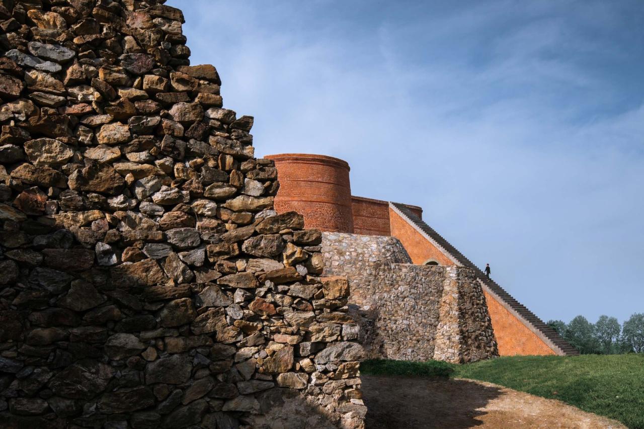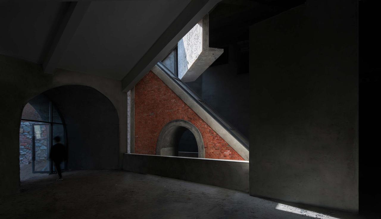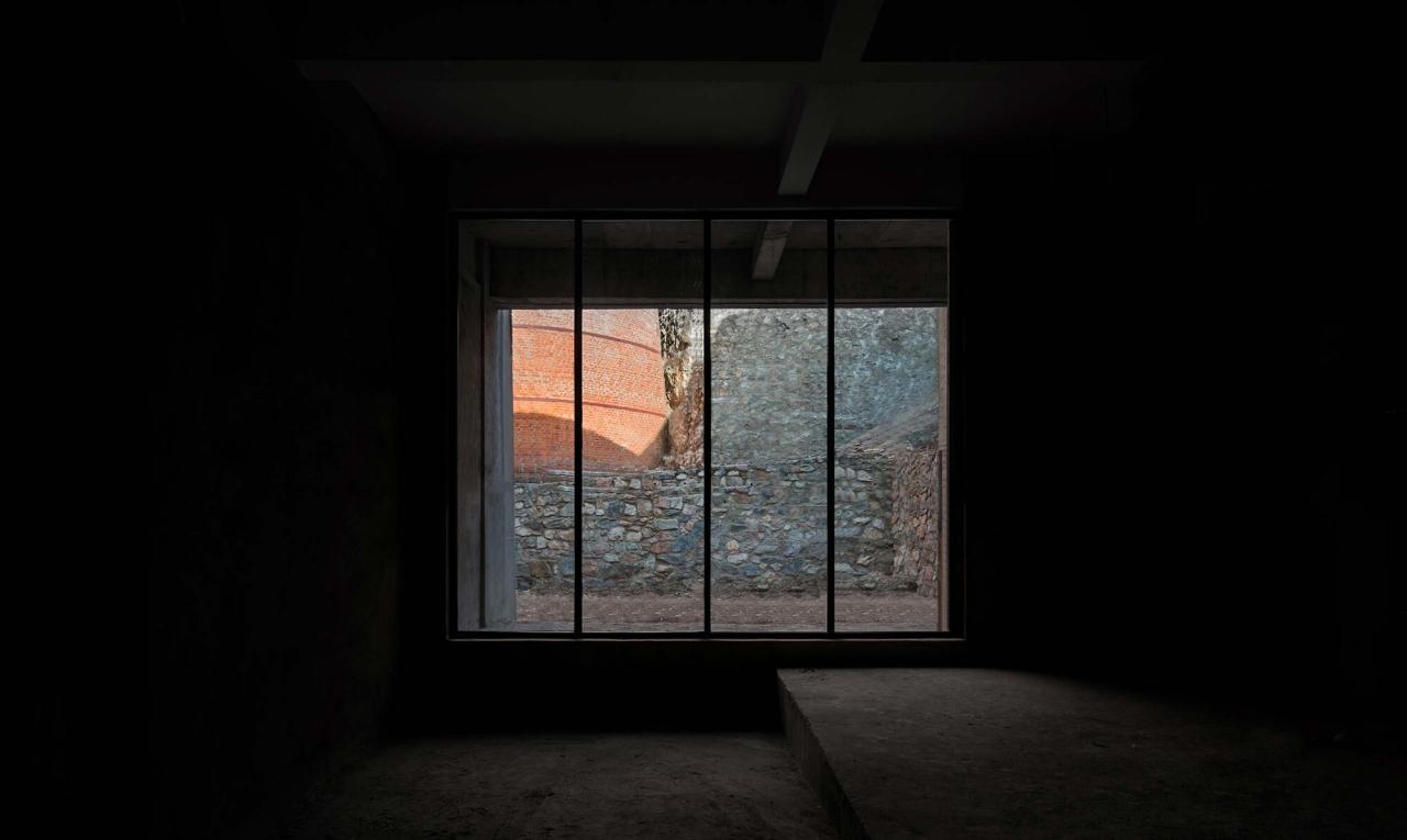 为了突出旧石灰窑,我们刻意弱化博物馆的形态及色彩,将其“藏匿”于旧石灰窑的背后,并将部分展示空间“压”入地下,使得博物馆的高度低于旧石灰窑。我们将在停产后尚未煅烧的石灰岩作为景观要素加以使用,在博物馆建筑的对应位置设置眺望窗和观景台,使得阳光下的旧石灰窑和不远处残缺的山体成为可以隔窗观望的大尺度真实展品,这一系列手法也使得博物馆建筑紧密地锚固在这一特殊的场所之中。