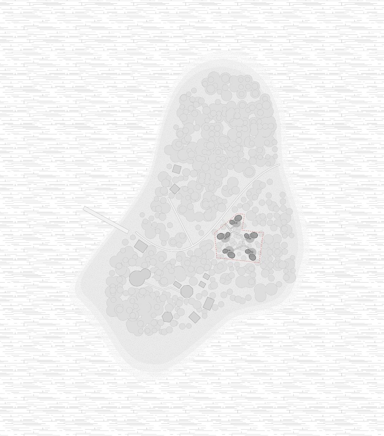 基地位于岛礁的中心地带,连接岛礁西南侧的游客中心与东侧一望无际的大海。基地内是茂密的棕榈树林与蜿蜒的小路。我们在树林中设计了五栋丛林树屋,每栋树屋由两个房间组成,可容纳2人并提供餐厅厨房等服务功能。五栋树屋的建筑面积总计约120平。