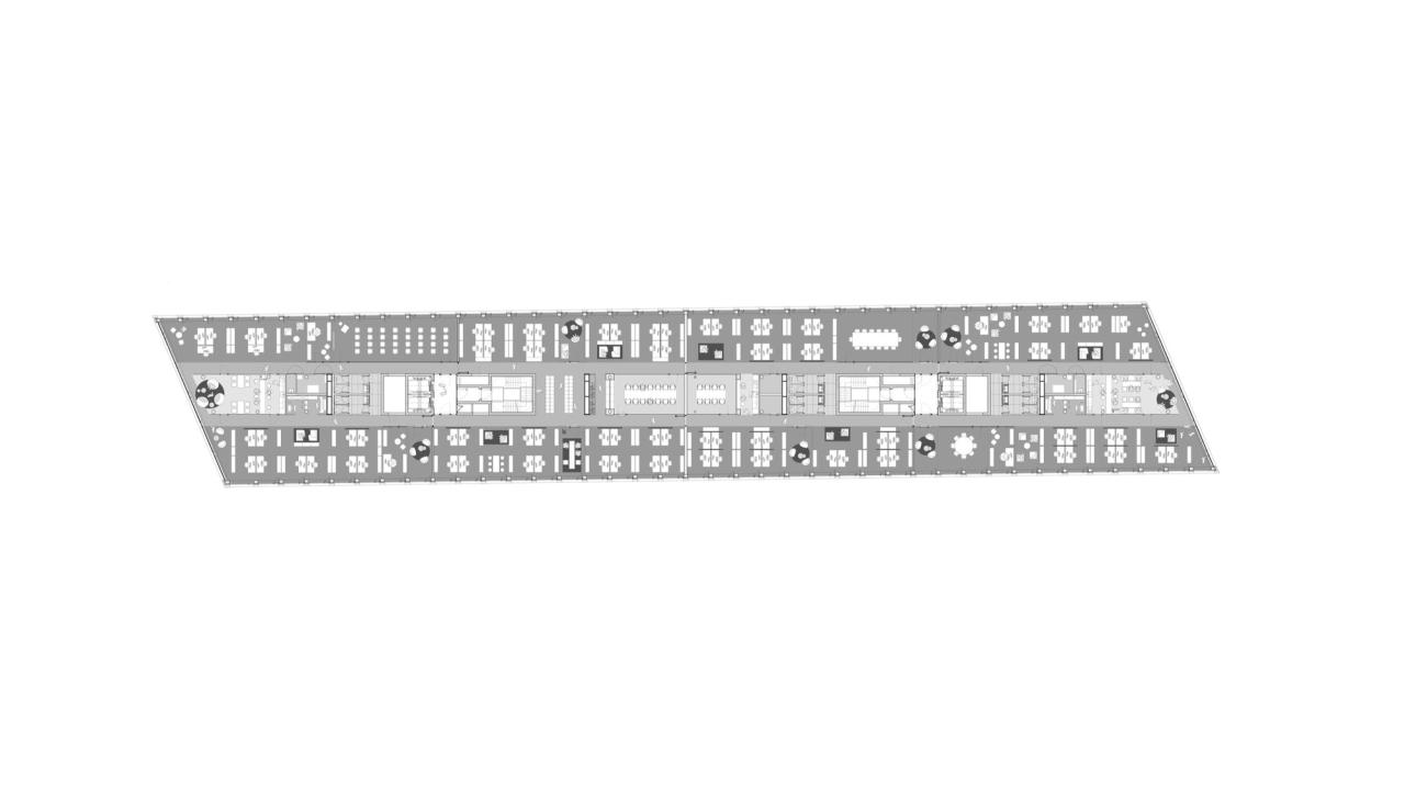 建筑一层设有 1200 平方米的高层高空间,以此用于餐饮或零售功能。餐厅和咖啡厅架构还将为建筑边全新设计的朴茨茅斯广场(Portsmouthplatz plaza)提供舒适的座位,并激活室内外公共通道空间,由此形成连接火车站及杜伊斯堡“市中心”的城市核心焦点。此外,这一办公大楼的实用性还体现在地下空间,这一大区域设有 2 层地下停车场、约 130 个停车位、以及建筑服务设施和仓储区域。