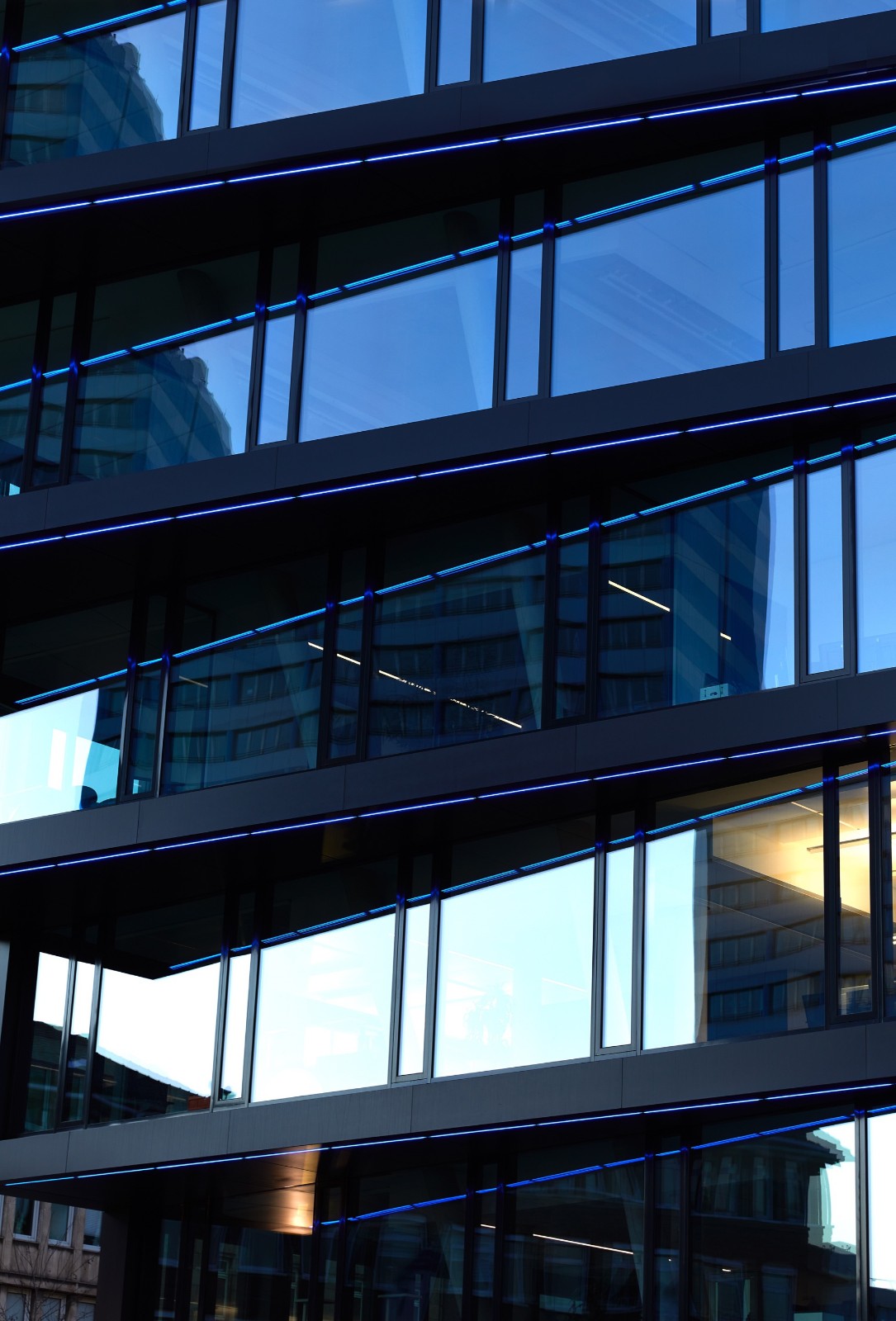 墨卡托一号的立面使用了由 Wicona 制造的 90%再生铝 Hydro CIRCAL。这一再生材料中的铝来自于先前的已拆除项目、汽车或食品包装,因此这一材料的制作、使用也可以被视为德国市场上具有开拓性的旗舰项目。此外,出于对隔热、隔音的考量,建筑安装了三重隔热太阳能控制玻璃,由此让立面玻璃板块也成为了遮阳的设施。同时,设有集成式照明的前沿天花板系统集结了供暖、制冷、换气、以及优化的声学效果等功能,由此让整体建筑有着超过 80%的热回收率。