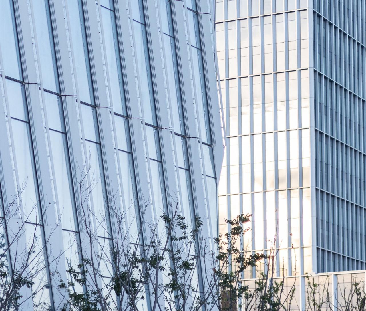 大楼的体块做了多次斜切,形成些微小倾角,顺应切角,大楼主体采用的是12度斜的单元式幕墙。幕墙分格区域是平行四边形,这些斜线在展开面上是连续的,环绕建筑上升。斜线也是“幕墙结构体系、通风器、室外亮化系统”等功能汇集带,隐藏在玻璃间的通风器具有隔音功能,可24小时持续通风换气,基本不受室外环境的影响。