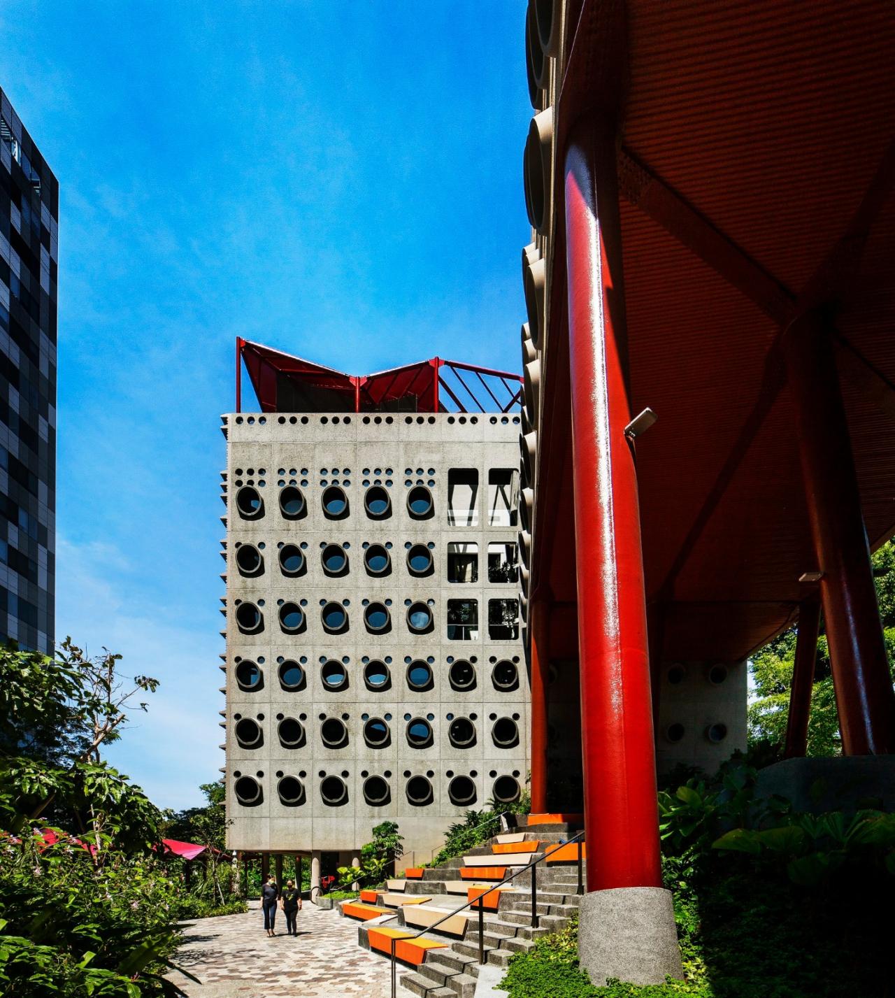 棱角分明的建筑几何形体从三个维度上延伸,并在地面层打造了如折纸般折叠的走道屋顶檐篷,以此为来往的人们提供可遮挡风雨的连廊。这些“三维”的棱角元素被赋予了鲜艳红色,以此在混凝土建筑群中脱颖而出,与之形成鲜明的对比。