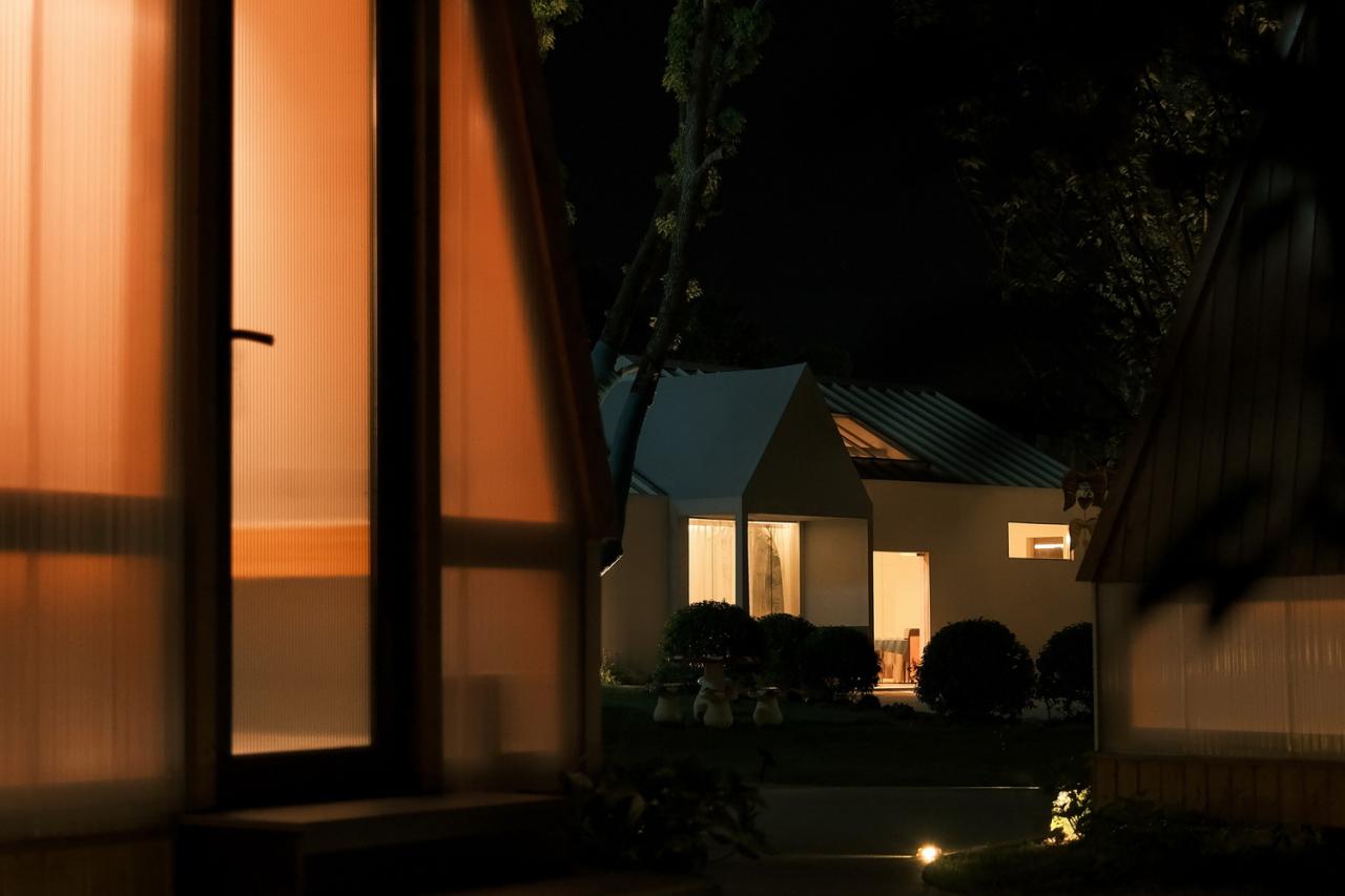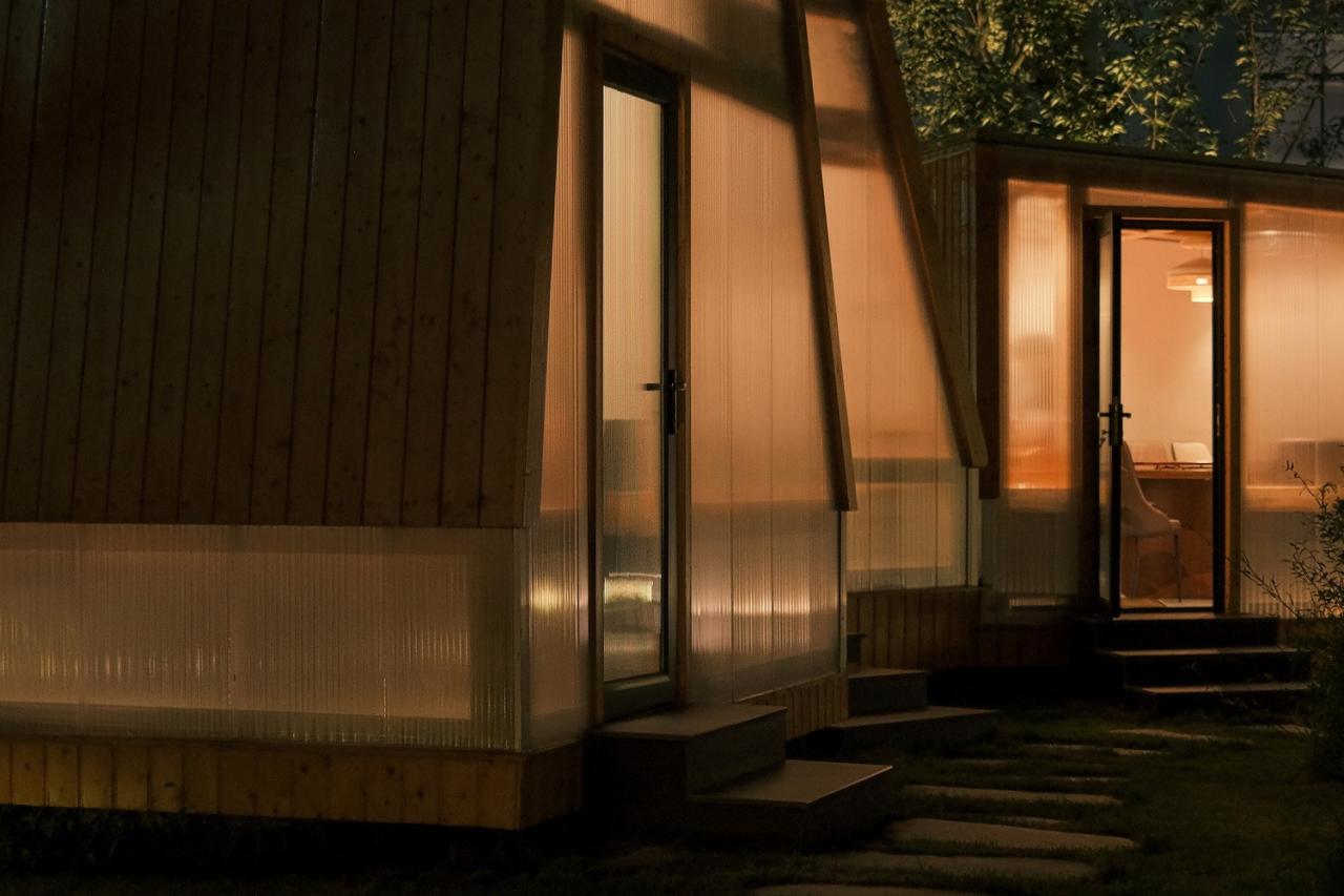 夜晚,室内的橘色的灯光从阳光板和小窗内透出,更显木屋的奇妙与独特。