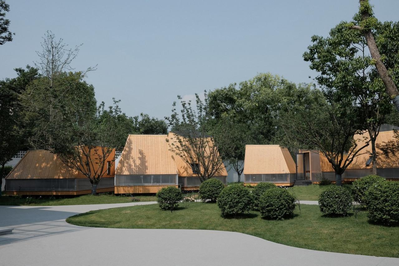 木屋部分一共分为六个单体,每个单体的尺寸,造型都有所不同。整体高低错落有致,灵动活泼,与环境灵活的结合在一起。六个木屋三个成一聚落,形成了两个组团,中间的空隙成为了行人和员工行走,送餐的主要路径。