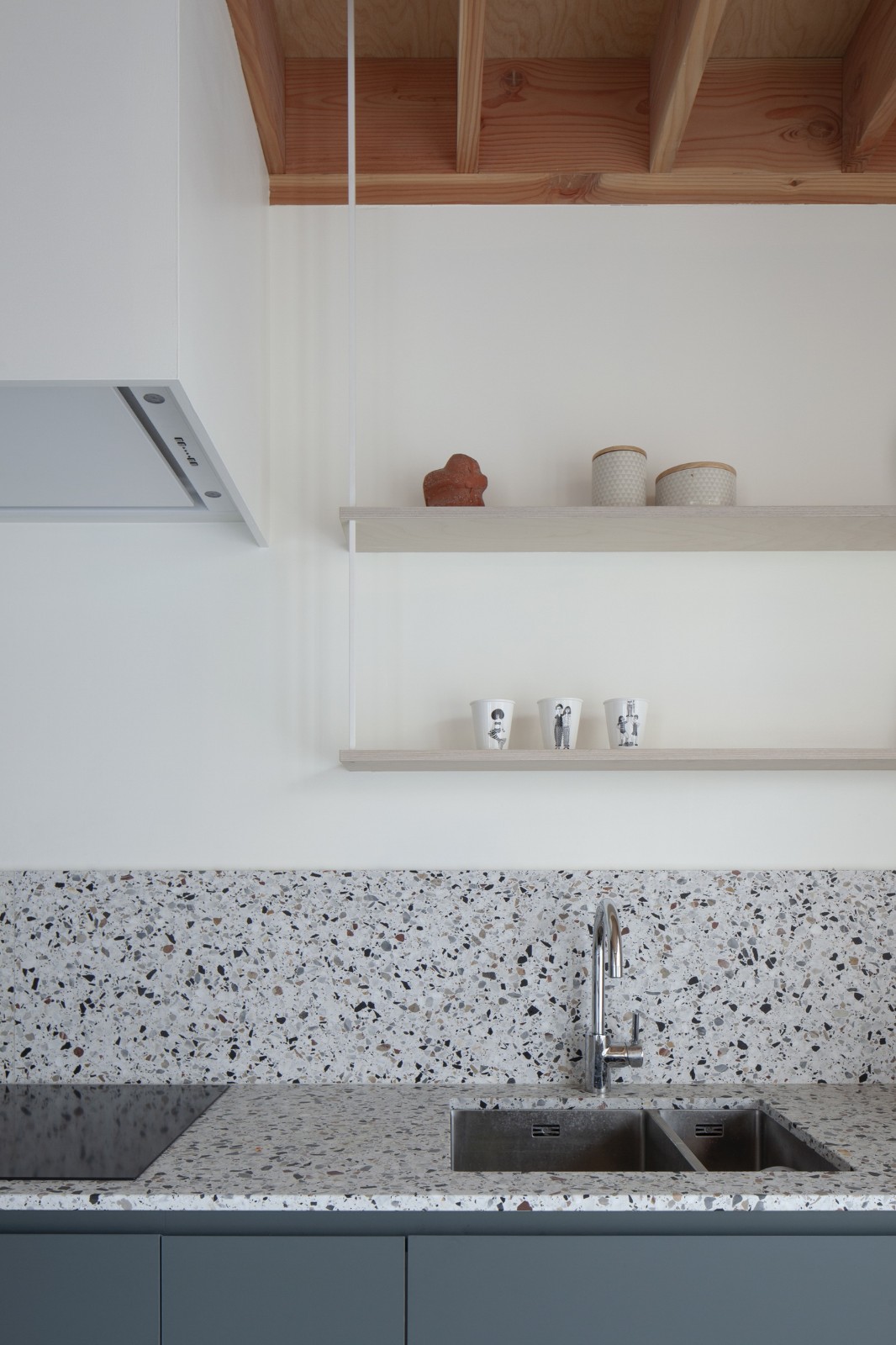 由于第二层的面积比第一层的面积小,设计师便在与生活区相邻的一层屋顶上增加了一个大露台。一个室外楼梯使之与地面相连接。在室内设计中沿用了建筑外部所使用材料。一楼的空间由砖块和混凝土地板组成,并经过抹灰处理。