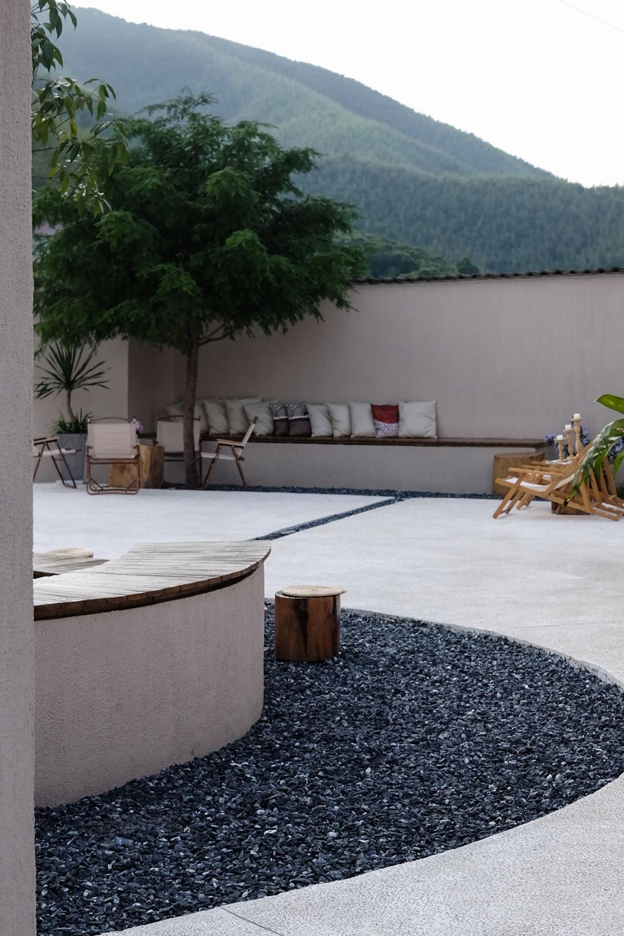 在材料的选择上,我们选用了水洗石,碎石,红砖等复古,自然的材料,以保证空间的经典和耐用。室外的涂料选择带有颜色的真石漆,在不同时段的光线下形成了微妙的色差,更有趣味。