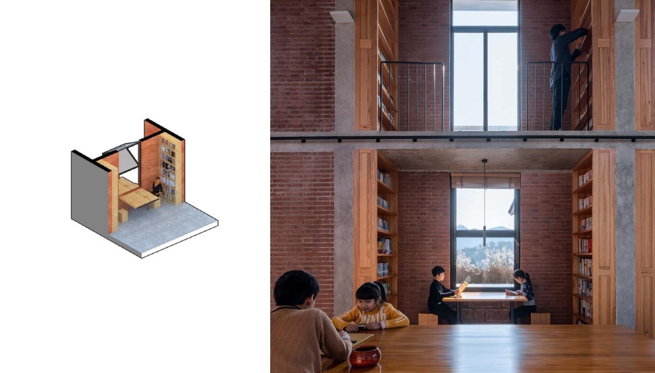 考虑到日照对阅读的影响,在建筑南北两侧设计了不同的阅览空间类型:建筑南侧,为避免阳光直射,座位采用侧向窗户的排布方式面对而坐;建筑北侧,无阳光直射,景观视野良好,将座椅正对窗户布置,阅读之余可观赏山坡景色。建筑西侧直面山景,我们采用了大玻璃面将景观引入室内,外立面设置的电动遮阳百叶,打开和关闭时候以不同的表情面对环境的变化。原有建筑南侧一层部分,改造为会议室,上部为木屋架,西侧横向的大玻璃窗将碾盘山景色一览无余的引入到室内。