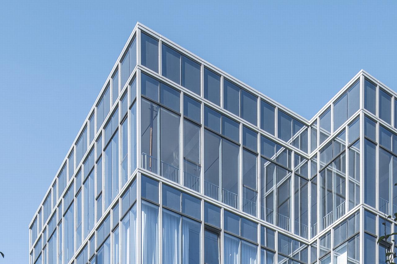为实现立面的轻盈通透,设计摒弃传统的窗墙体系,采用类幕墙体系。通过与技术团队的多次沟通,我们最终将混凝土挑板厚度确定为120mm,尽可能的消解了梁柱的厚重感,带来立面的轻盈感。同时,在挑板之外包铝板幕墙,形成200mm精致线脚。在上部每层单元中,采用65mm的幕墙式竖向杆件,消解了粗壮的传统窗框。