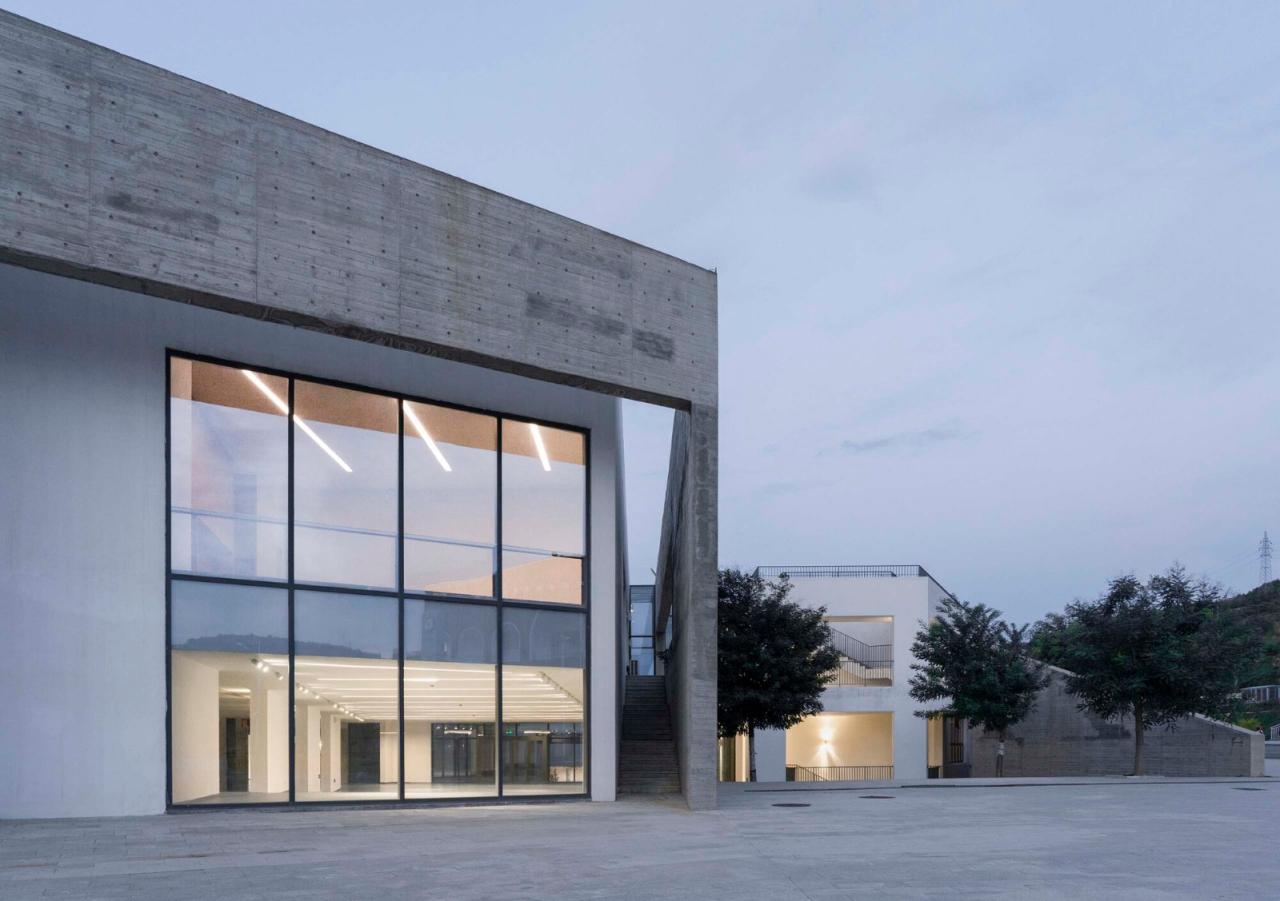 我们将折叠的墙体依地势顺延,图书馆、美术、音乐地理等专业课室及展厅分别置于墙体之间,形成一个建筑与庭院相间的布局形式。