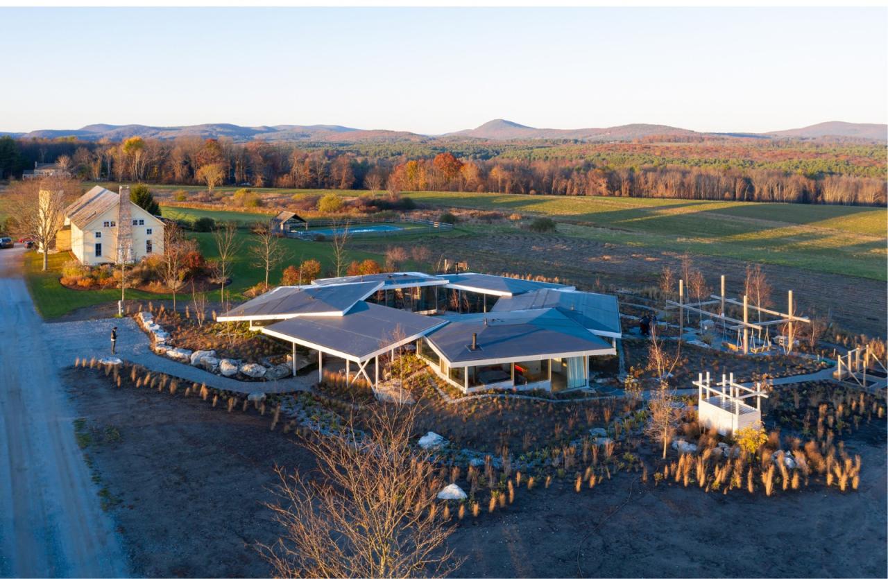 “花之家”由六个“花瓣”小屋体量围绕中央开放庭院,小屋相互紧扣、组合形成“花”型建筑,它通过与当地自然景观及平面布局的动态互动,重新诠释并拓展了玻璃屋的类型定义。
